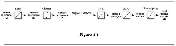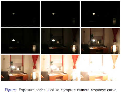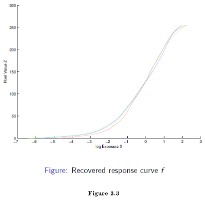 The LDR of a single digital photograph contains accurate radiance information only for correctly exposed pixels. Changing the exposure captures radiance information for different sets of pixels. To accurately analyze a sequence of photographs to extract radiance information for the entire scene, we must take into account the way the camera sensor responds to different levels of light. First, we try and get the camera response curve f, which tells us how scene radiance E is mapped to pixel brightness Z. Using the inverse of f allows us to reproduce actual scene radiance E. The curve f is different for each camera and we compute f from a series of exposures.