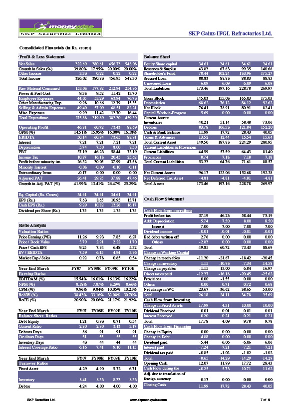 The Above Table indicates the Consistent growth in the steel industry has helped in increasing the demand for refractories. Organic and inorganic expansions by IRL to meet the growing demand and continuous cost cutting strategies will increase its revenues and overall margins. We expect the company's net sales and PAT to grow at a CAGR-Compound Annual growth rate of 19.31% and 21.58% respectively, over FY07-10.
