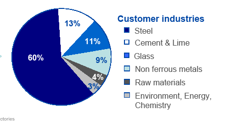 Iron and steel production consumes more than 55% of the total demand for refractories: therefore, the profitability of the refractories industry as a whole is strongly influenced by steel production levels and steel plant investments.. Refractory industry development is directly connected with development of an iron and steel industry which provides mass introduction of alternative and energy-saving technologies. Refractory products have changed over the years, from the making of simple firebrick a century ago to today's technically complex brick and monolithic products. The success of these products has changed the industry's sales cycle, as customers are now able to put off replacing their ladles and furnace linings because of these better-engineered products. Longer-life, more efficient kiln and vessel bricks have added months to the steel and cement industry's production run times and have increased capacity.