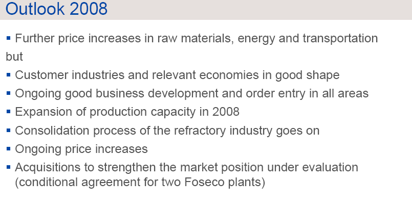 Overall growth in steel production in Western European for the period 2003– 2007 is expected to average 1.6% per year, with high growth in 2004 and less towards the end of this period. East European steel production should continue to show healthy growth in this period. These factors will have an impact on the demand for refractories
