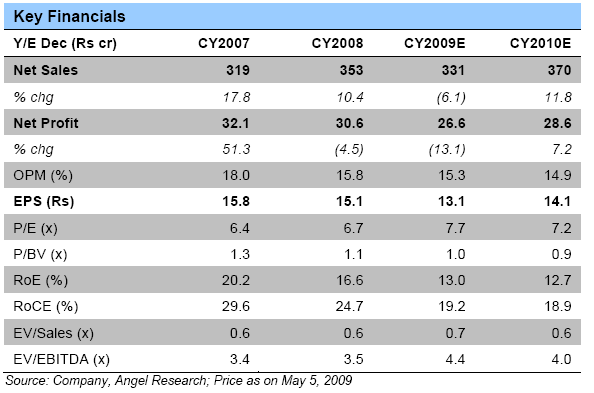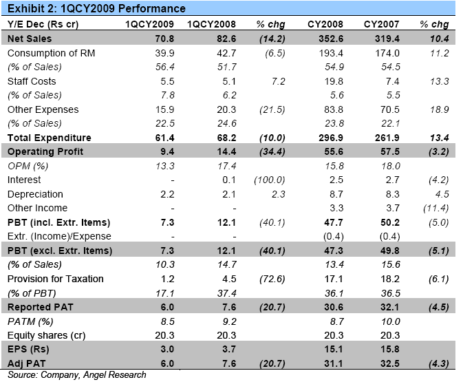Top-line down 14.2%: Vesuvius India’s (Vesuvius) Top-line declined by 14.2% yoy during 1QCY2009 to Rs70.8cr (Rs82.6cr) on the back of lower Volumes and fall in Realisations. We believe this trend will continue for some more quarters on account of the decline in Realisations.