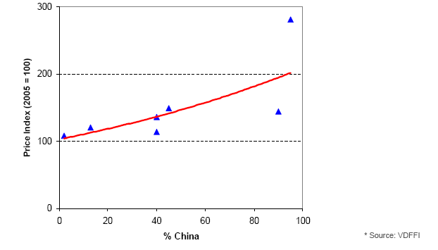 The price evolution of refractory raw materials* seems to be greatly influenced by the degree of dependence on Chinese sources: