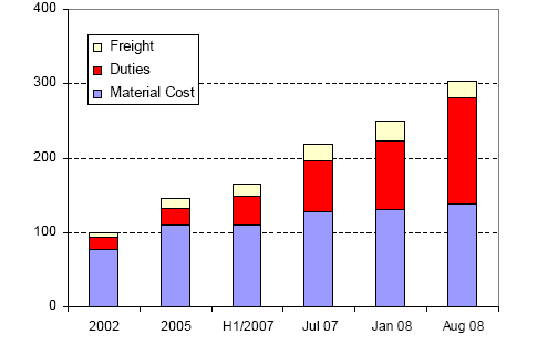 Since 2002, magnesia prices have increased by 80% in China and by more than 200% for international buyers. Due to licensing and taxation of exported raw materials, Chinese domestic producers of magnesia bricks have a cost advantage in European and export markets of approx. 30%