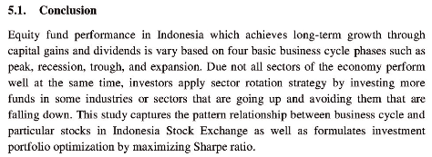 The author recommended for the investors to consider using sector rotation investment strategy in optimizing their investment portfolio. Balance weight method is preferred than modified portfolio by Solver method because it generates higher ending investment and risk adjusted return. Nonetheless, investors should rethink about all assumptions in this research to be implemented in the real investment world such as sufficient historical market price, positive annual growth expectation, transaction fee, lot size, and so forth. The investors should also make careful decision in analyzing business cycle phase, sector choice, stock selection, and investment portfolio construction by keep updating the information regularly. For further research, the author recommended to keep using sector rotation investment strategy in future period and assess its performance whether the strategy will be still effective and feasible to apply or not.