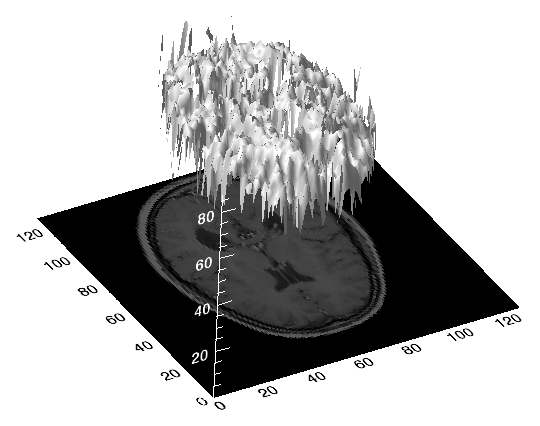 Two-dimensional MR image of the brain. B: Pixel values of the MR image plotted on the