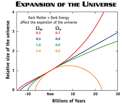 Possible scenarios for the expansion (and possibly contraction) of the universe: the bottom orange curve represents a closed, high density universe which expands for several billion years, then ultimately turns around and collapses under its own weight. The green curve represents a flat, critical density universe in which the expansion rate continually slows down (the curves becomes ever more horizontal). The blue curve shows an open, low density universe whose expansion is also slowing down, but not as much as the previous two because the pull of gravity is not as strong. The top ( red) curve shows a universe in which a large fraction of the matter is in a form dubbed "dark energy" which is causing the expansion of the universe to speed up (accelerate). There is growing evidence that our universe is following the red curve.