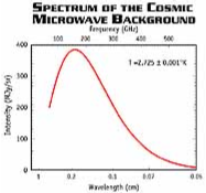This figure shows the prediction of the Big Bang theory for the energy spectrum of the cosmic microwave background radiation compared to the observed energy spectrum. The FIRAS experiment measured the spectrum at 34 equally spaced points along the blackbody curve. The error bars on the data points are so small that they can not be seen under the predicted curve in the figure! There is no alternative theory yet proposed that predicts this energy spectrum. The accurate measurement of its shape was another important test of the Big Bang theory.