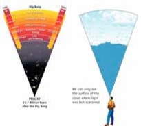 The behavior of CMB photons moving through the early universe is analogous to the propagation of optical light through the Earth's atmosphere. Water droplets in a cloud are very effective at scattering light, while optical light moves freely through clear air. Thus, on a cloudy day, we can look through the air out towards the clouds, but can not see through the opaque clouds. Cosmologists studying the cosmic microwave background radiation can look through much of the universe back to when it was opaque: a view back to 400,000 years after the Big Bang. This “wall of light“ is called the surface of last scattering since it was the last time most of the CMB photons directly scattered off of matter. When we make maps of the temperature of the CMB, we are mapping this surface of last scattering.