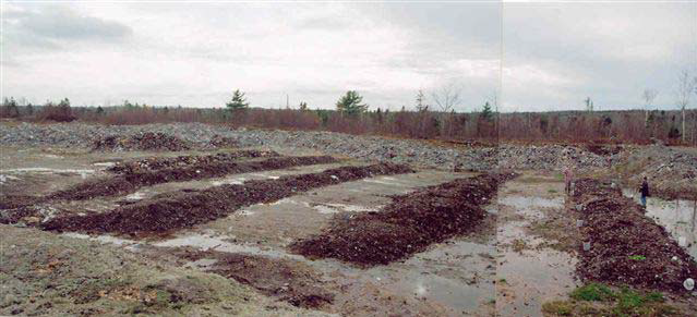 Thick layers of feedstock are avoided because they impede oxygen penetration into the windrow. This can cause the worms to migrate to the upper surface before lower layers are thoroughly digested, creating anaerobic fermentation. The windrows are irrigated with center post sprinkler up to twice daily to maintain optimum moisture content of 80% throughout the windrow. Now the material on top is removed to start a new row, and the material on the bottom is vermicompost. The new row can be started in a new location. Or it can be moved longitudinally by about 20' by dumping the worm inhabited material past the end of the row, digging out some vermicompost, and then shuffling some more worms over.
