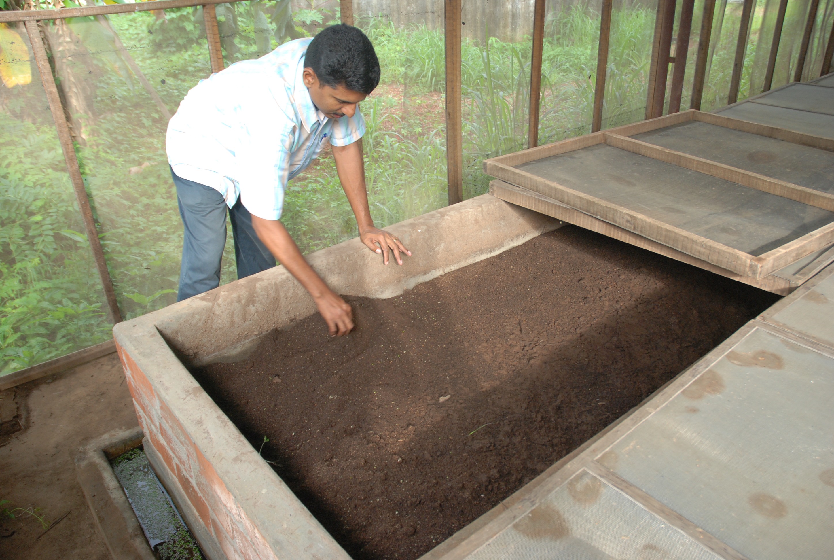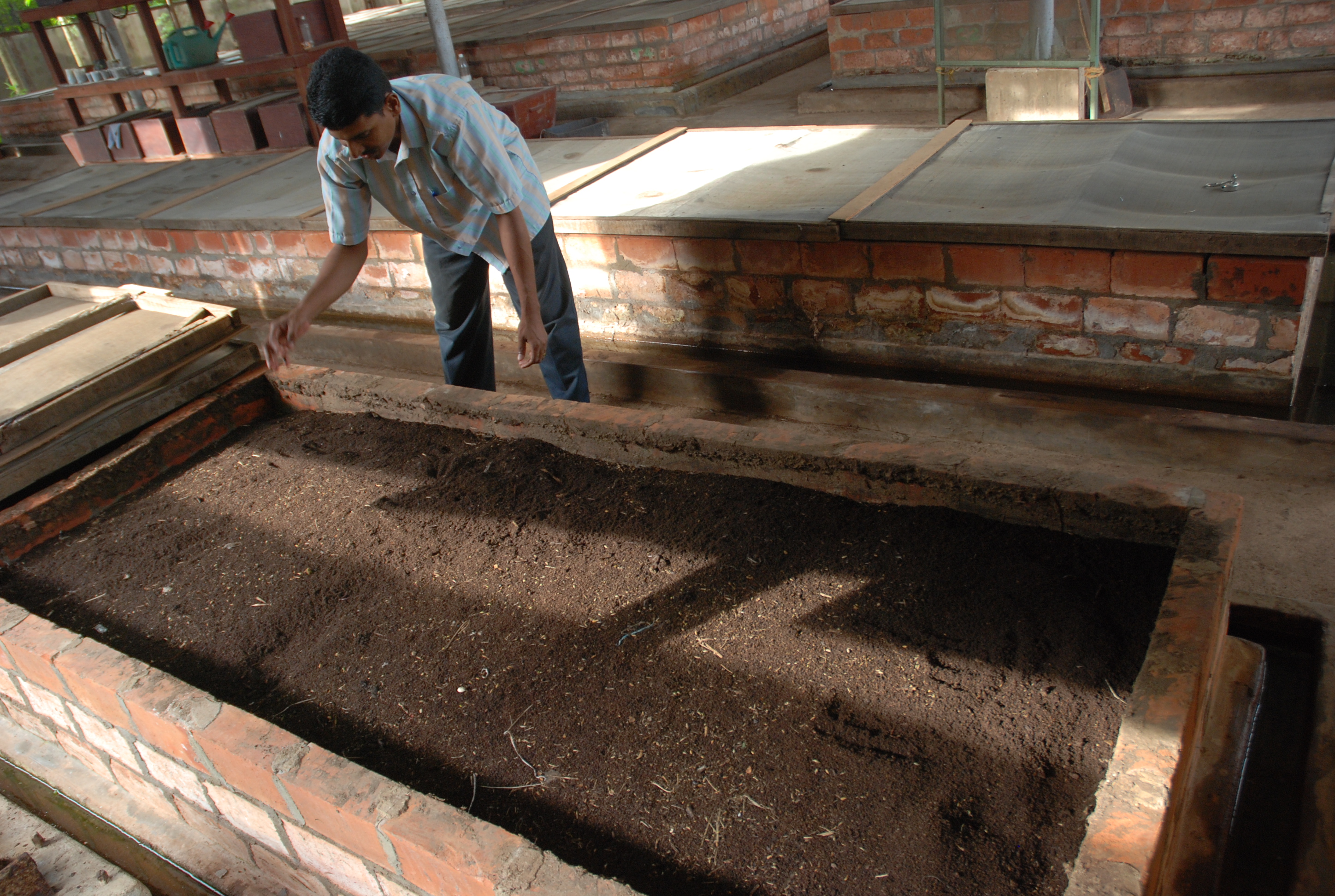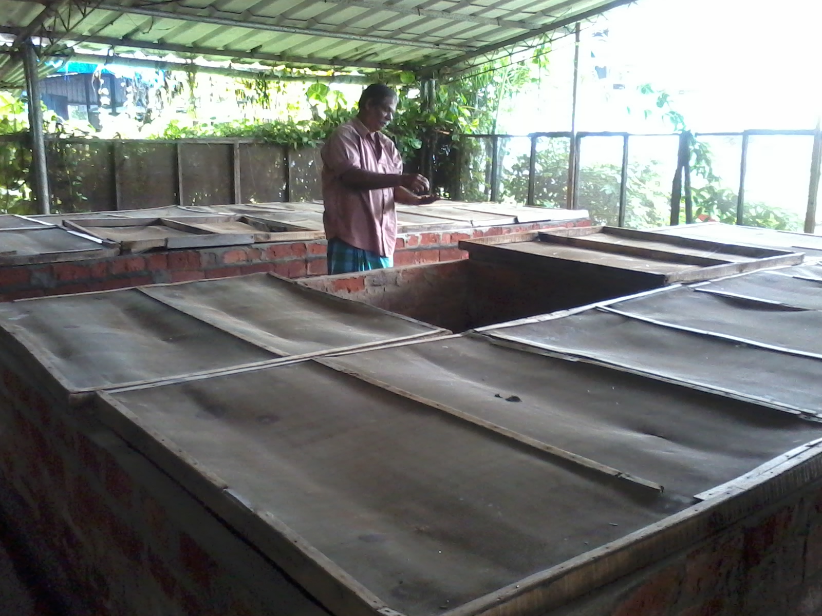 The commercial model for vermicomposting consists of four chambers enclosed by a wall (1.5 m width, 4.5 m length and 0.9 m height). The walls are made up of different materials such as normal bricks, hollow bricks, asbestos sheets and locally available rocks. This model contains partition walls with small holes to facilitate easy movement of earthworms from one chamber to another. Providing an outlet at one corner of each chamber with as light slope facilitates collection of excess water, which is reused later or used as earthworm leachate on crop. The four components of a tank are filled with plant residues one after another. The first chamber is filled layer by layer along with cow dung and then earthworms are released. Then the second chamber is filled layer by layer. Once the contents in the first chamber are processed the earthworms move to chamber 2, which is already filled and ready for earthworms. This facilitates harvesting of decomposed material from the first chamber and also saves labor for harvesting and introducing earthworms. This technology reduces labour cost and saves water as well as time.