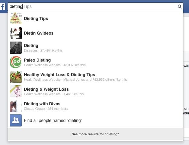 For example, type “dieting” into the search bar in Facebook and click “See More Results” at the bottom of the drop down menu: