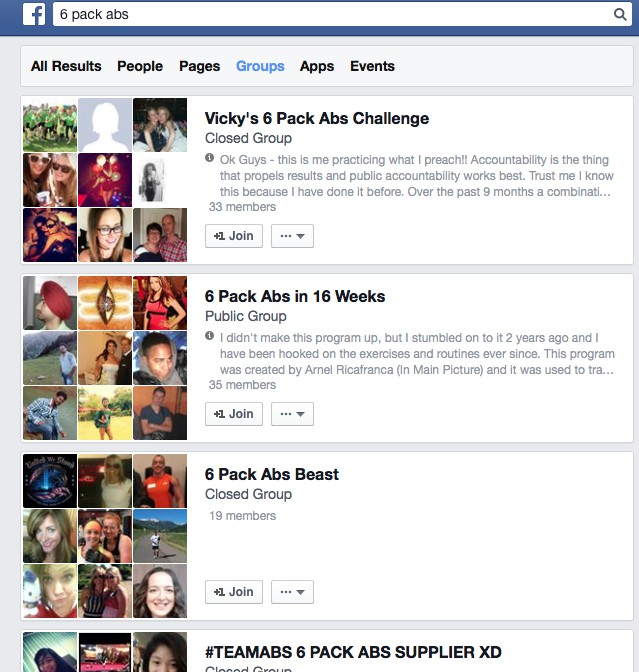 Here is a great sign that people are very interested in getting 6 pack abs/a flat stomach. There may not seem to be a lot of people in the groups, but there are a lot of them and some have higher numbers. Also, some of the groups being private shows that they only want certain people in their group. This might be because they have bought a product and are offered a Facebook group as a bonus to the purchase.