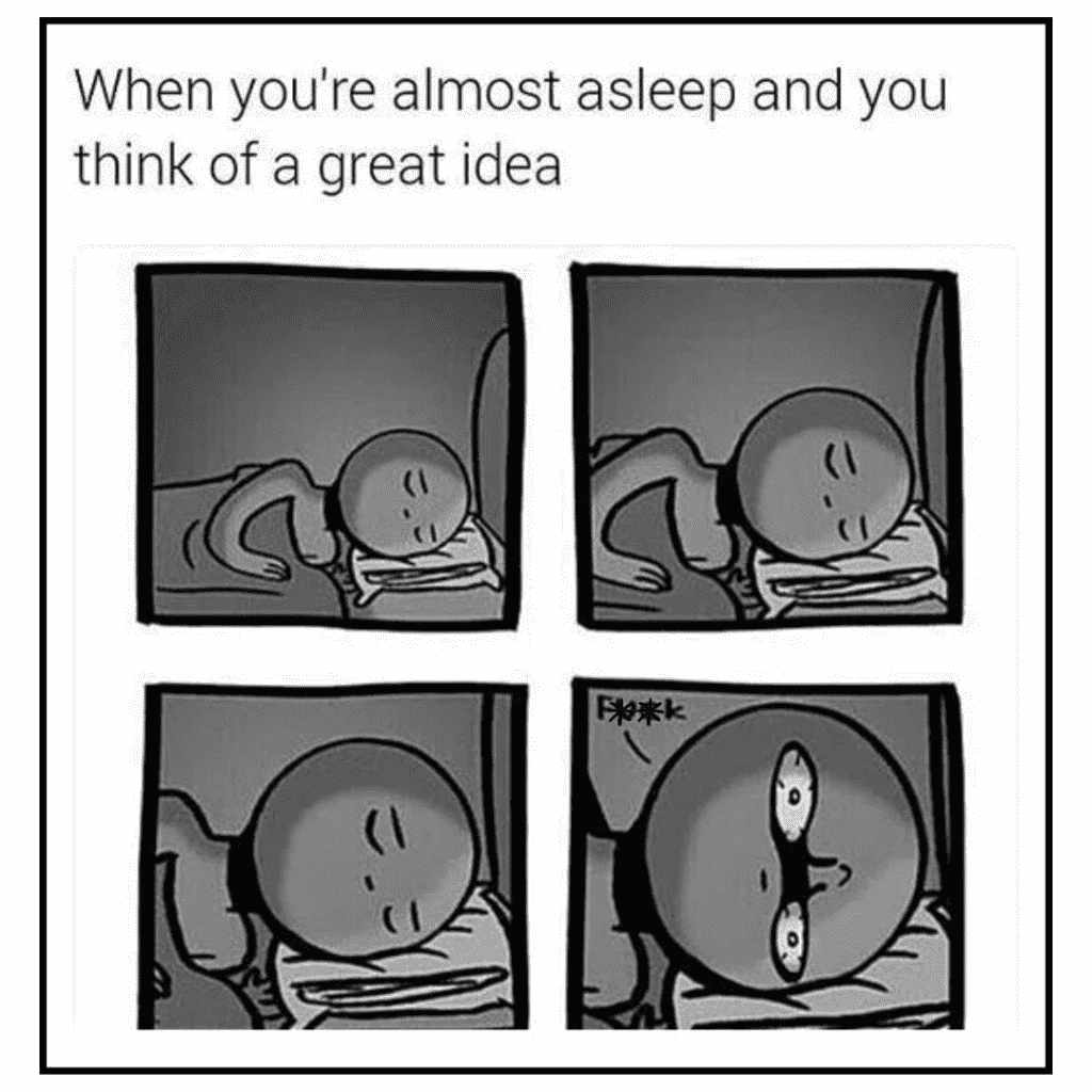 In the middle of the night when you are trying to sleep and then your mind suggests a wonderful idea. That idea doesn’t let you sleep unless you write a little summary about it in one of your handbooks or Google notes. It’s an idea that keeps us awake. 😂