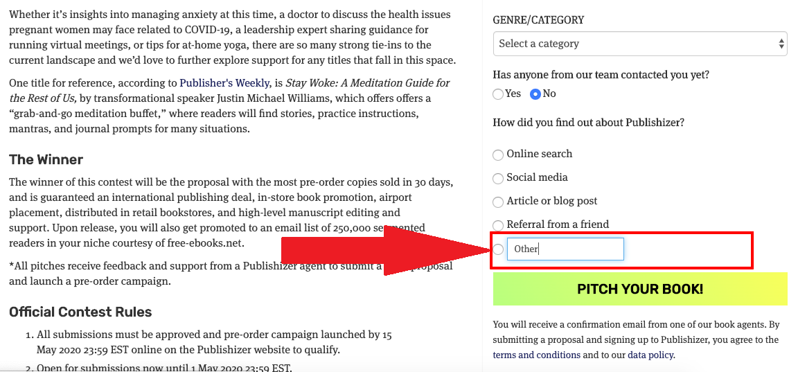 IMPORTANT: Be sure to write Free-eBooks.net in the pitch form as per the screenshot below. Those that do this are eligible for a number of BONUS promotions should you win, so it’s important you do skip this part to max out your potential