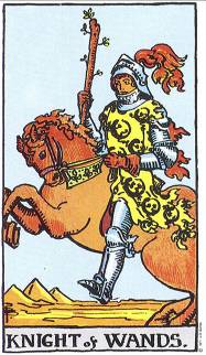 When the Knight of Wands appears he may indicate yourself, another person close to you, someone who may enter your life, an aspect of your own personality or an aspect of yourself that needs to be recognized, developed or asserted. He may also represent a situation that you may find yourself in.