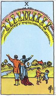 A young married couple stands together and raises their arms in delight and wonder towards a semicircle of ten cups that are arranged inside a rainbow that has appeared in the clear blue sky above them. Nearby their two children dance by their side in carefree and playful abandon. Their modest family home is in the distance, surrounded by trees and greenery. To their left a peaceful blue stream meanders through their property.