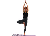 Balancing on the left foot, raise both arms over the head, keep the elbows unbent