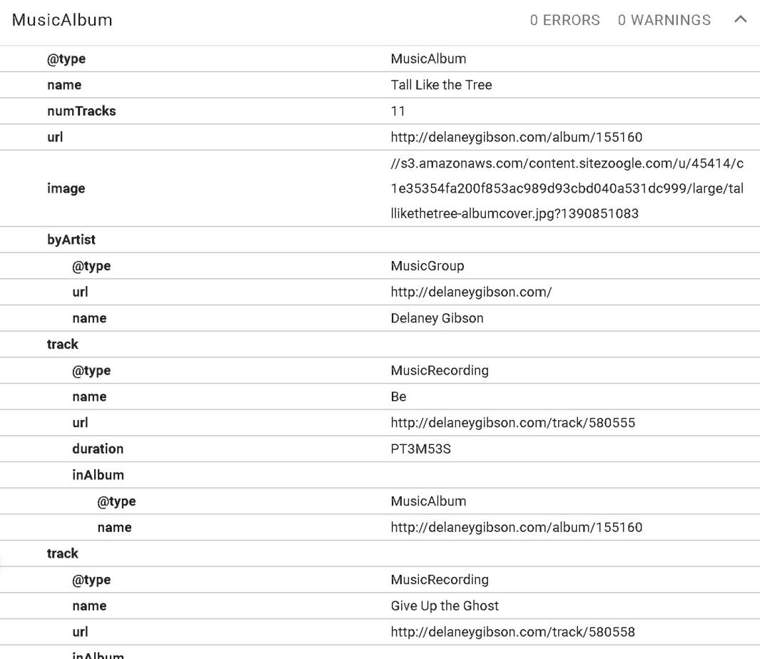 Let’s look at an example of what this schema looks like. This screenshot shows the schema on an album page of Delaney Gibson’s Bandzoogle website: