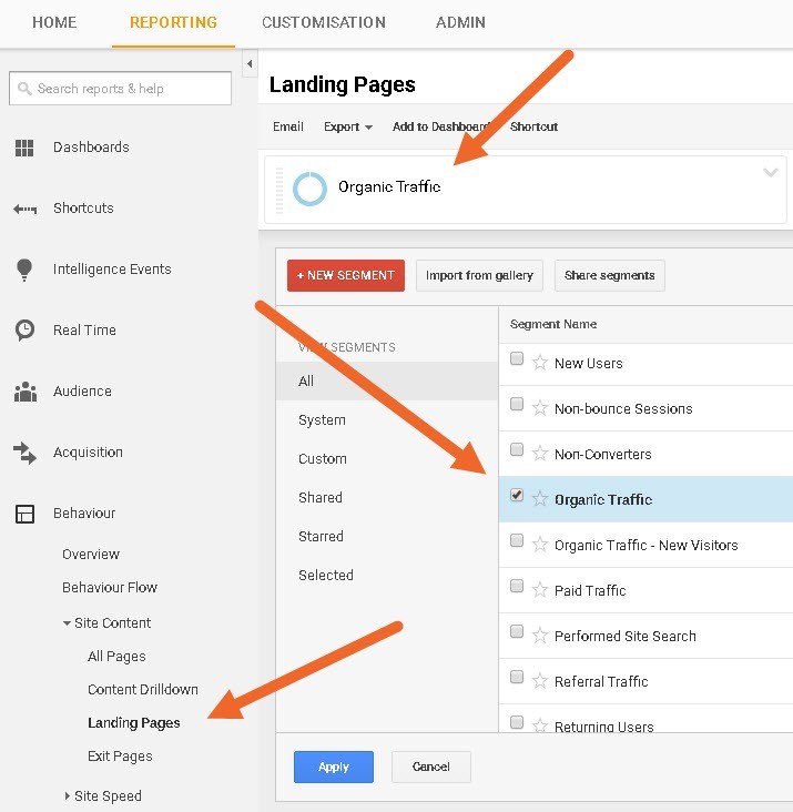 If you have Google Analytics set up on your website (which you absolutely should), you can find organic search traffic data by selecting the “Organic Traffic” Advanced Segment as below.
