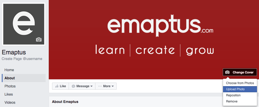 Once created, you can upload a cover photo. If you’re creating a cover photo yourself, the dimensions are 851px x 315px. Alternatively you can use the free website