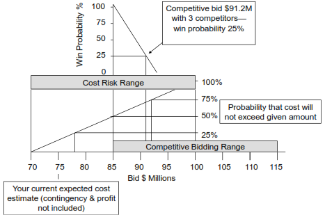 Suppose you have used the Best Bid model (see chapter 13) to determine that to be competitive you need to bid $91.2 million on a particular project. You have three competitors (N = 3) and according to the model, a bid of $91.2 million will provide a competitive win probability of 0.25 (25%) given the competitive pressure in the bidding environment.