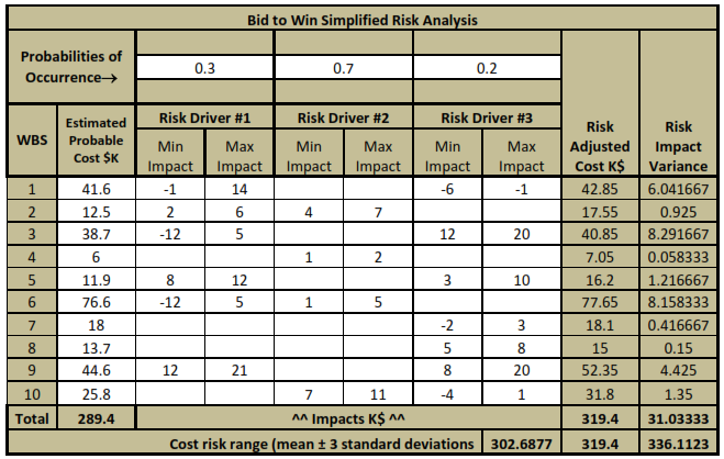In this exhibit, the risk drivers are represented by “min” and “max” impact values with respect to each task, and also by probability of occurrence values. The impacts are assumed to occur only if the risk drivers occur. The combined effects of each risk driver are collected in the columns headed Risk Adjusted Cost $K and Risk Driver Impact Variance. (For readers with a background in statistics, the risk adjusted cost is a “mean” or “expected value,” and the variance is the square of the standard deviation. For simplicity, each risk driver range is assumed to represent a uniform distribution of the cost impacts.)