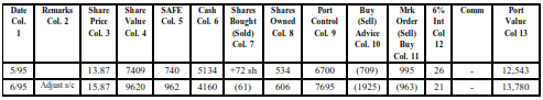 SHARE VALUE is 606 X $15.87 = $9,620. SAFE is always 10% of SHARE VALUE so SAFE is 962. CASH was affected by readjusting our stock/cache ratio. We started with $5,134 - $995 excess cash + INTEREST of $21 = $4,160. PORTFOLIO CONTROL is again smaller: