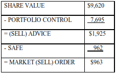 You have a (SELL) MARKET ORDER. Divide $963 by the SHARE PRICE of $15.87 and you find that you sold (61) shares. Write in column 7. Then end the month by figuring your PORTFOLIO VALUE. $9,620 + $4,160 equals $13,780.