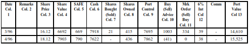 Onto April 96. SHARE PRICE is $18.12, up $2 from last month up. Go to columns 8 and 9. You bought 21 shares last month so your SHARES OWNED has increased from 415 to 436. PORTFOLIO CONTROL will increase since we did buy stock. Divide 334 by 2 and add that amount to PORTFOLIO CONTROL (334 divided by two = 167 + 7,695 equals 7,862). Write these two numbers in. SHARE VALUE is 436 X $18.12 equals $7,903. SAFE is 790. CASH is $7,918 - $3 34 + $30 INTEREST = $7,622. Again compare PORTFOLIO CONTROL and SHARE VALUE and SHARE VALUE is slightly higher. Do your calculations: