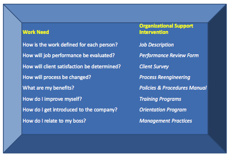 Thus, the focus of organizational support in this book is that it is to be systematically identified and provided in all its necessary dimensions as it relates to the organization or re/organization of work execution on an ongoing basis. An alignment between work execution and organizational support is something that requires real and constant attention; otherwise the work execution suffers and ultimately the business is harmed.