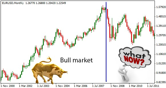 Look at the EUR/USD chart from January 2001 until July 2008. The uptrend was pretty strong most of the time. If you pushed the “Buy” button, you would win most of the time even with a poor trading system. The consistent rise of the euro over the dollar was giving you a clear sense of the overall trend.