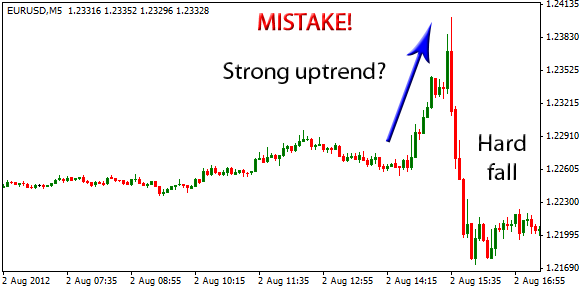 What you see in this chart is explosive price movement that is usually the result of a news release. All brokers, platforms and various currency tools are indicating a “strong uptrend”, tempting people to jump in and make a profit. What happens next is, at best, a choppy zone, or a hard fall.