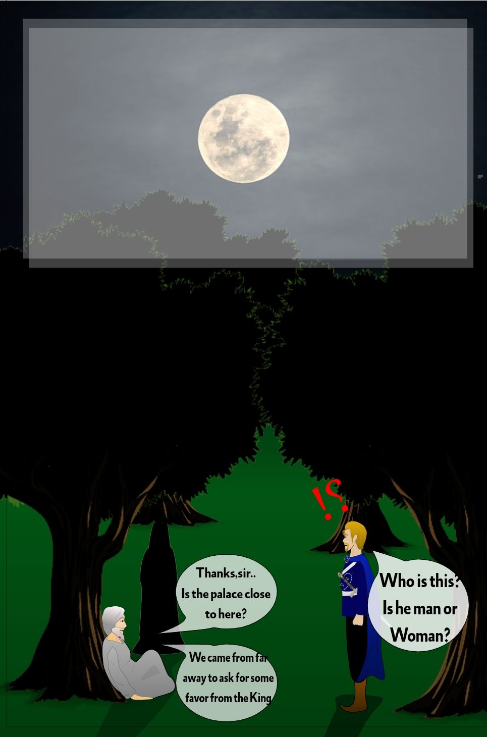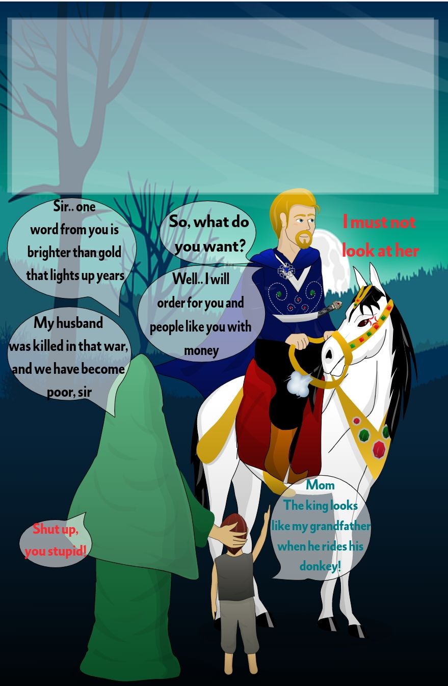 The voice of an old ill man -who was able to be seen in the moonlight- answered him thanking, while the other person who was hidden with clothes from head to toe did not answer, so the King could not recognize him at all. He asked the elder about him and he answered coughing: