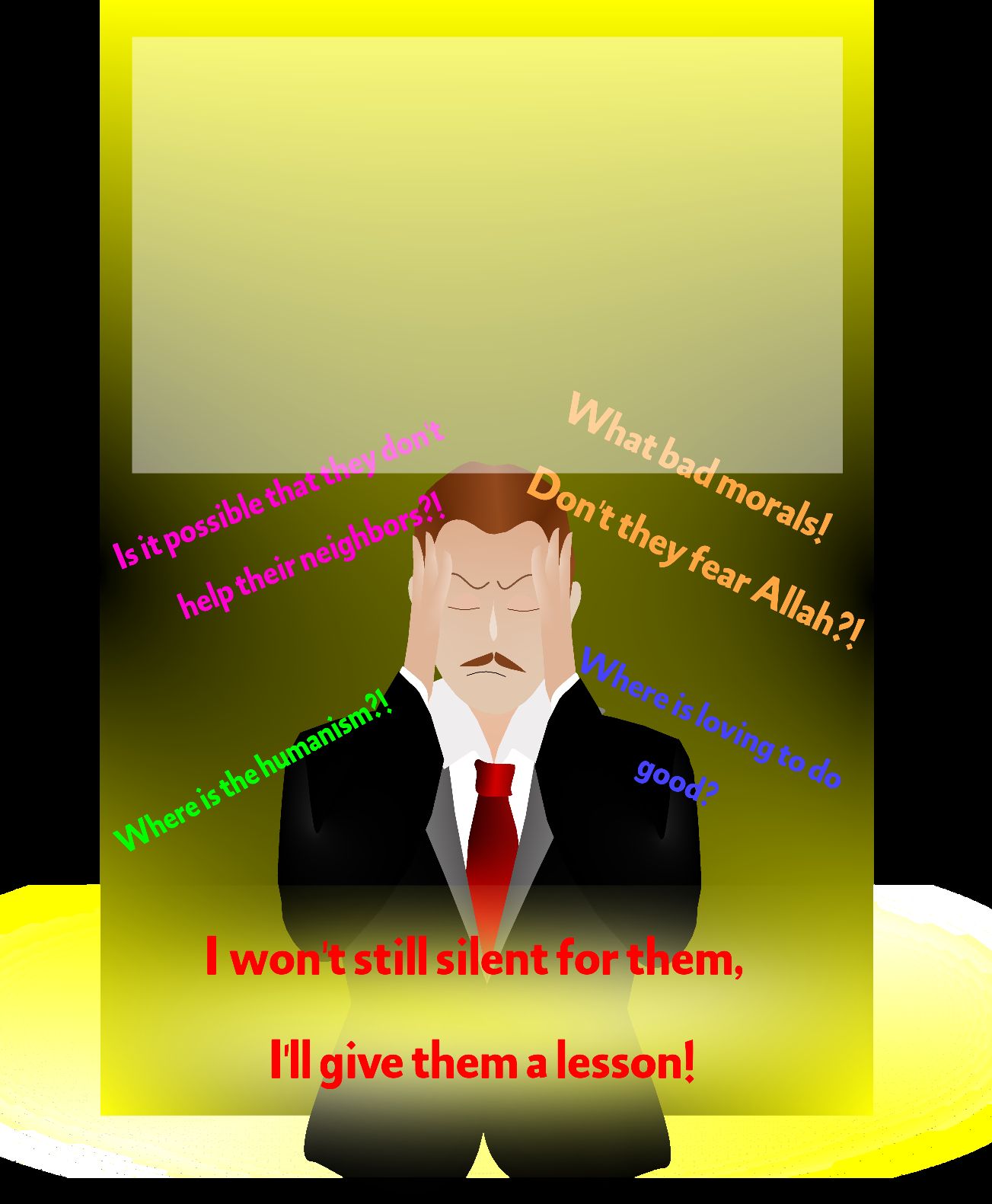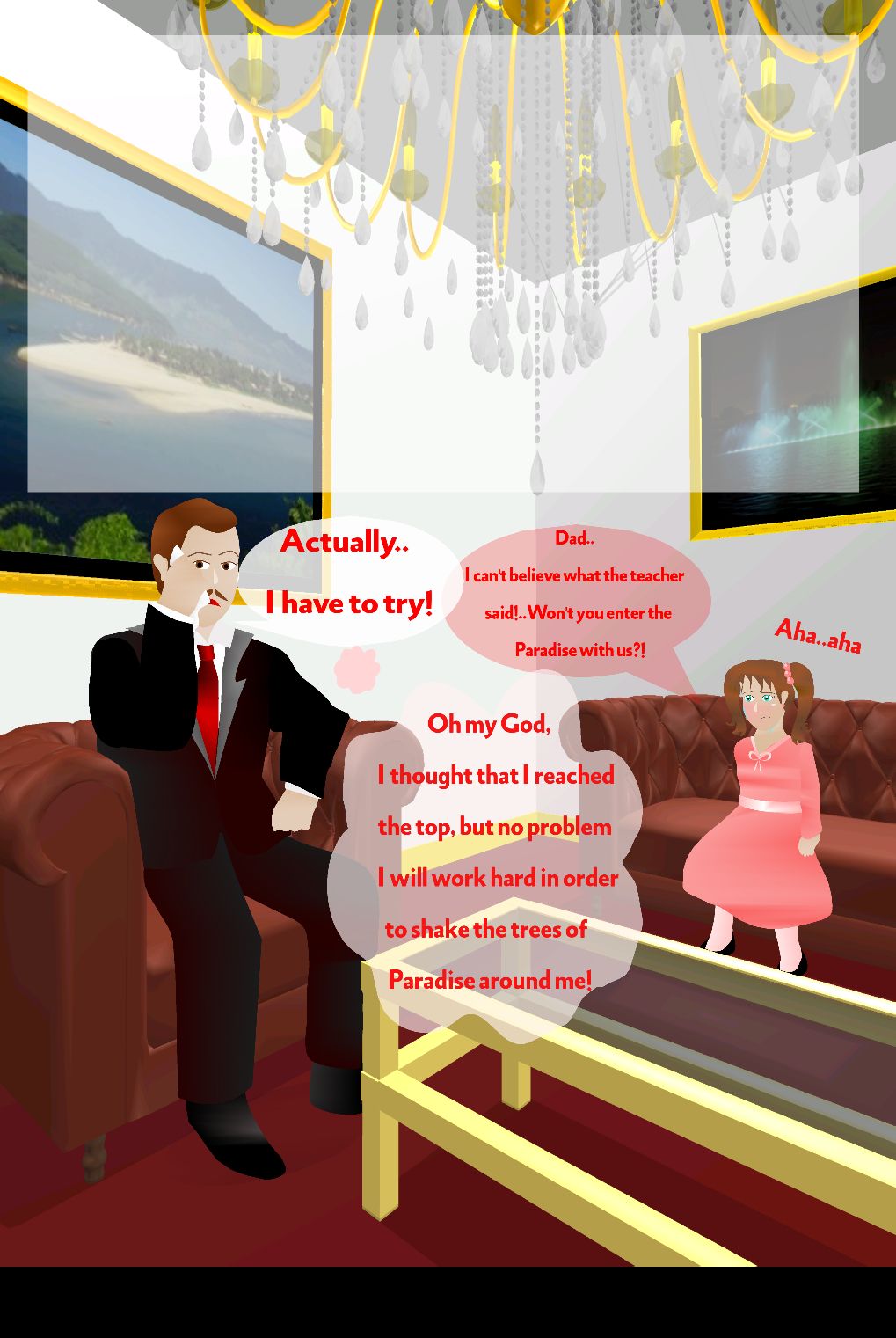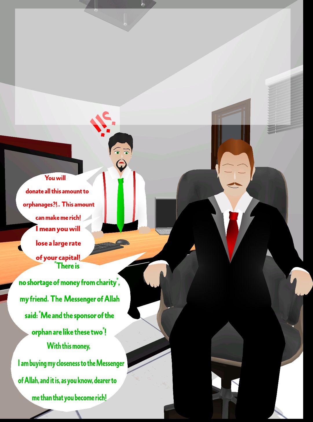 Mazen remained silent and no longer knew an answer. He broke into a sweat when he saw the tears of his daughter crying for him; Unfortunately, he was preoccupied with collecting money far from his religion, so he nether memorized the hadiths of the Messenger of Allah, PBUH, nor knew about them, so he began to think: “For many years I have been doing the impossible in order to possess every dignity so that I will never feel embarrassed.. Well, it seems that the story of my struggle ( My fight) in life is not over!"