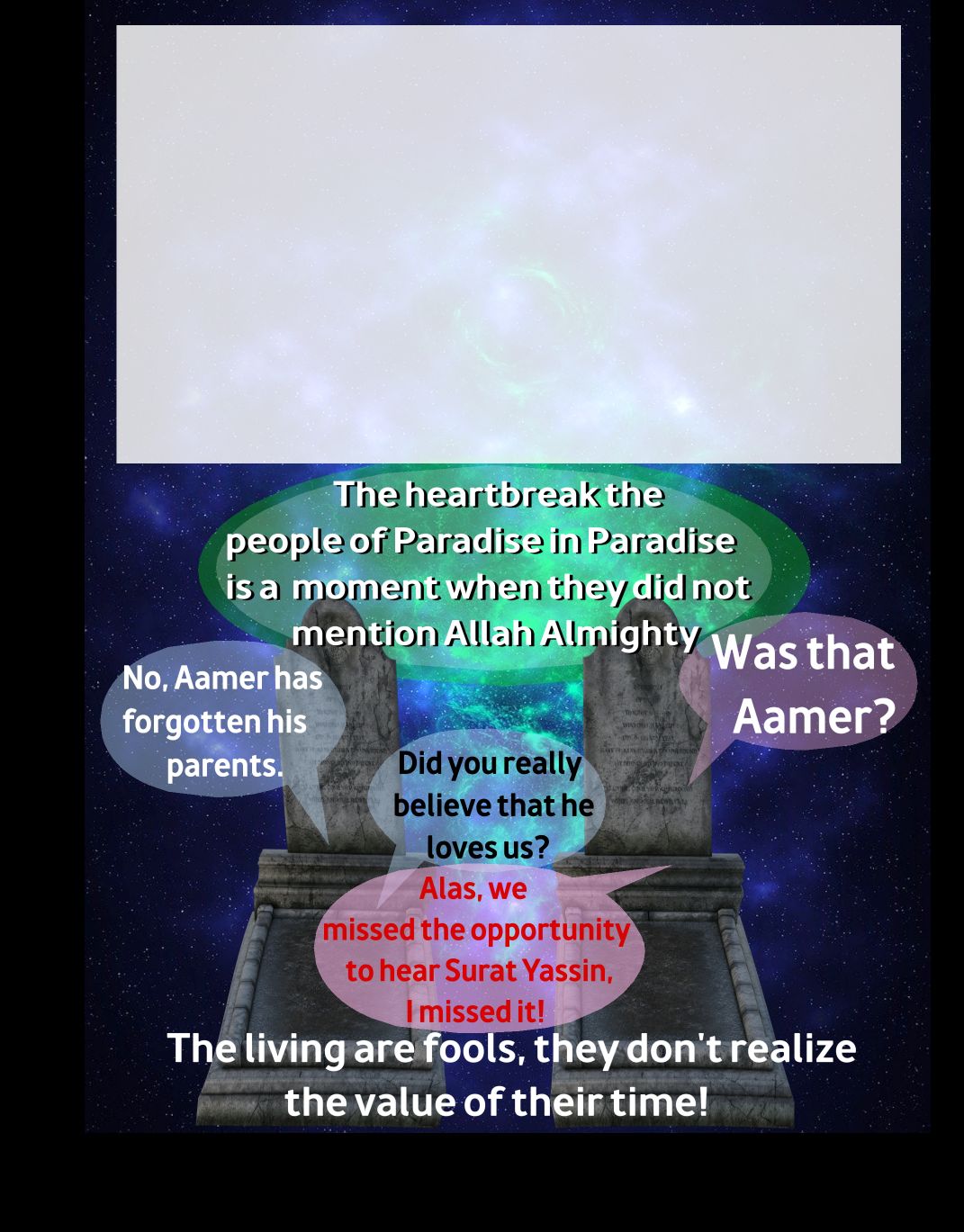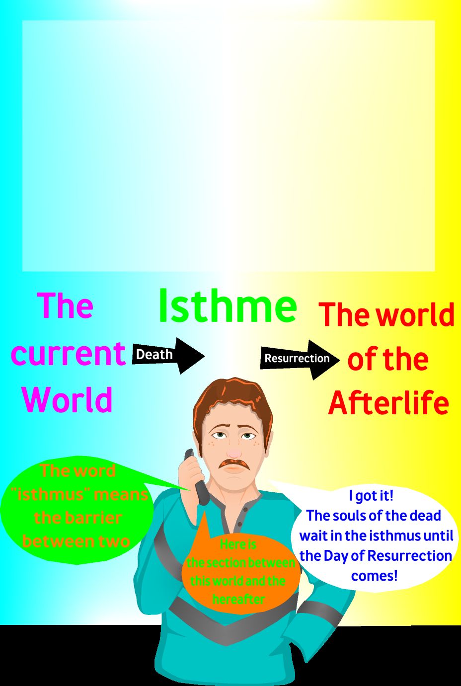 Aamer froze when he heard his father's voice saying to him: Aamer, where are you, my son??.. Finally, Amer replied: I am here, but where are you, Dad?.. Father: I am here; in the isthmus.. Aamer: Isthmus?!.. What is the isthmus?.. Father: It is the world in which the dead will remain, waiting for the Day of Resurrection until they know their fate; Either to Paradis or to Hell.