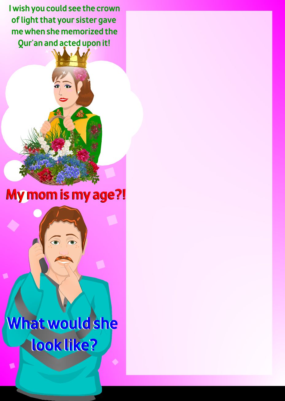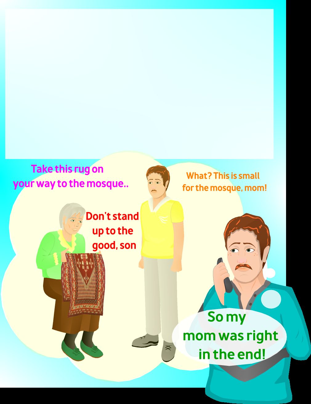 Aamer: That new rug that you donated to the mosque, it was just a small rug! The mother: Nevertheless, as the Prophet (peace be upon him) said: “Do not belittle any good deed.” This little rug is very useful to me. Whenever someone prays on it, the good deeds will come to my account on a plate of gold!