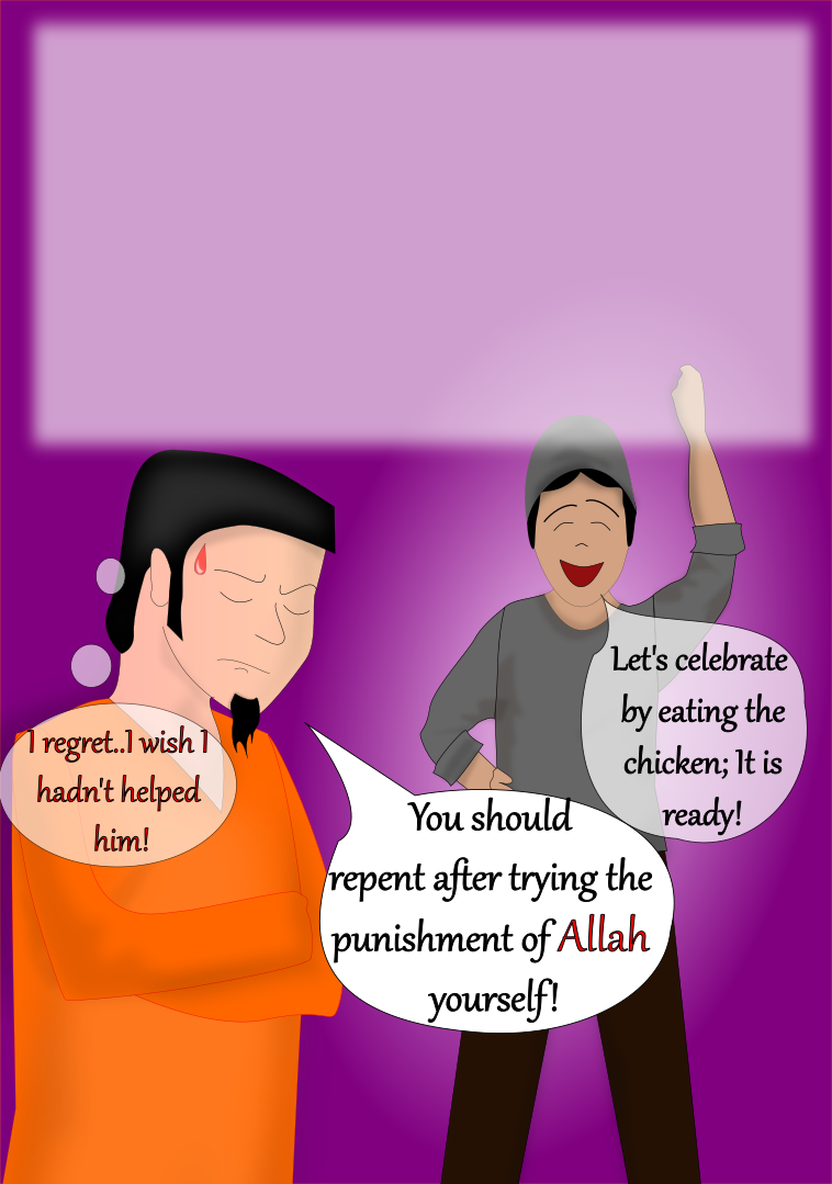 Soon, the thief infiltrated his house, brought his knife, and slaughtered the chicken while dreaming of a hearty meal for lunch, forgetting that it was forbidden money. In this time, I discovered the theft and hurried to tel my grandpa, but I was surprised when my grandpa had replied calmly before returning to sleep: