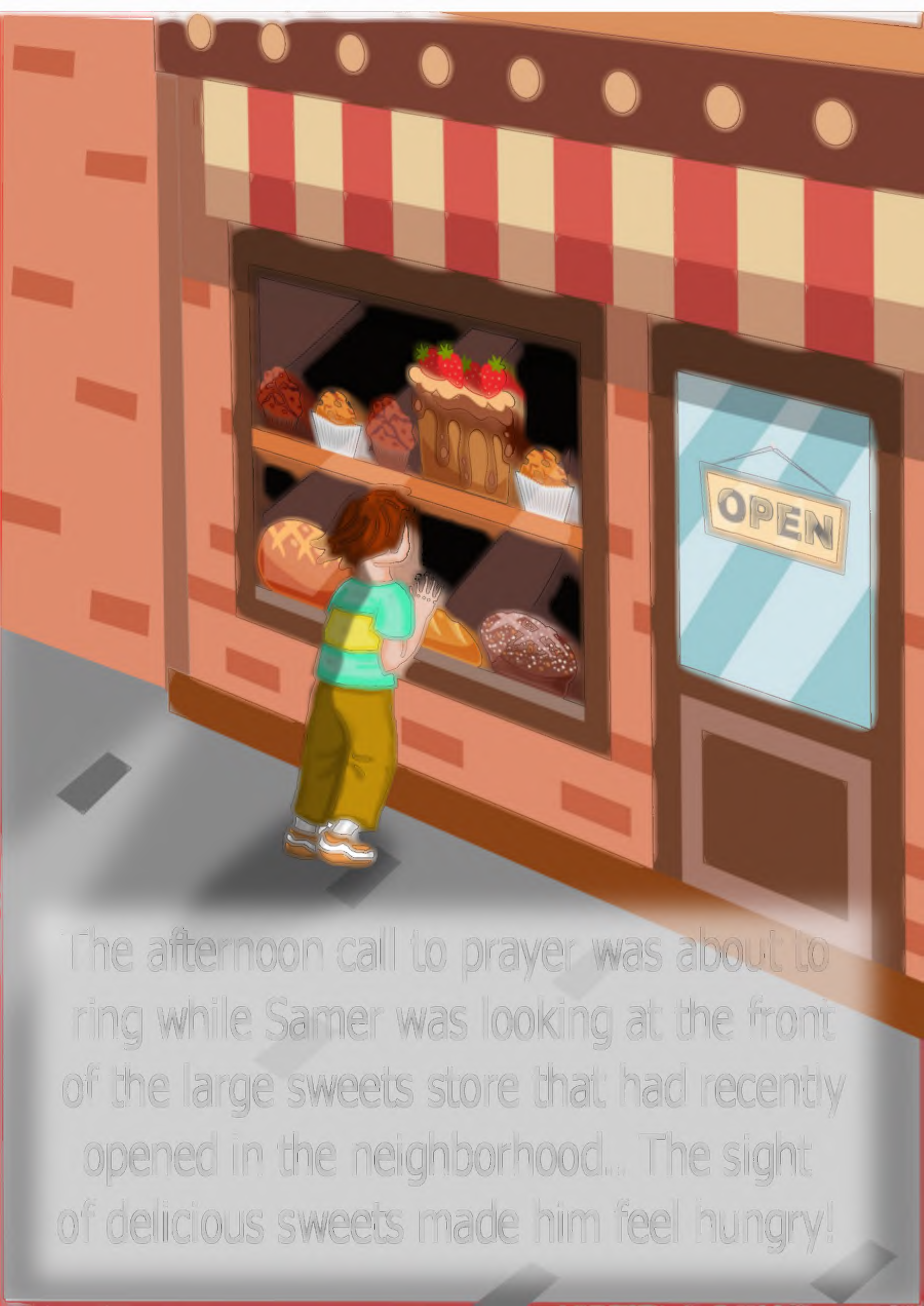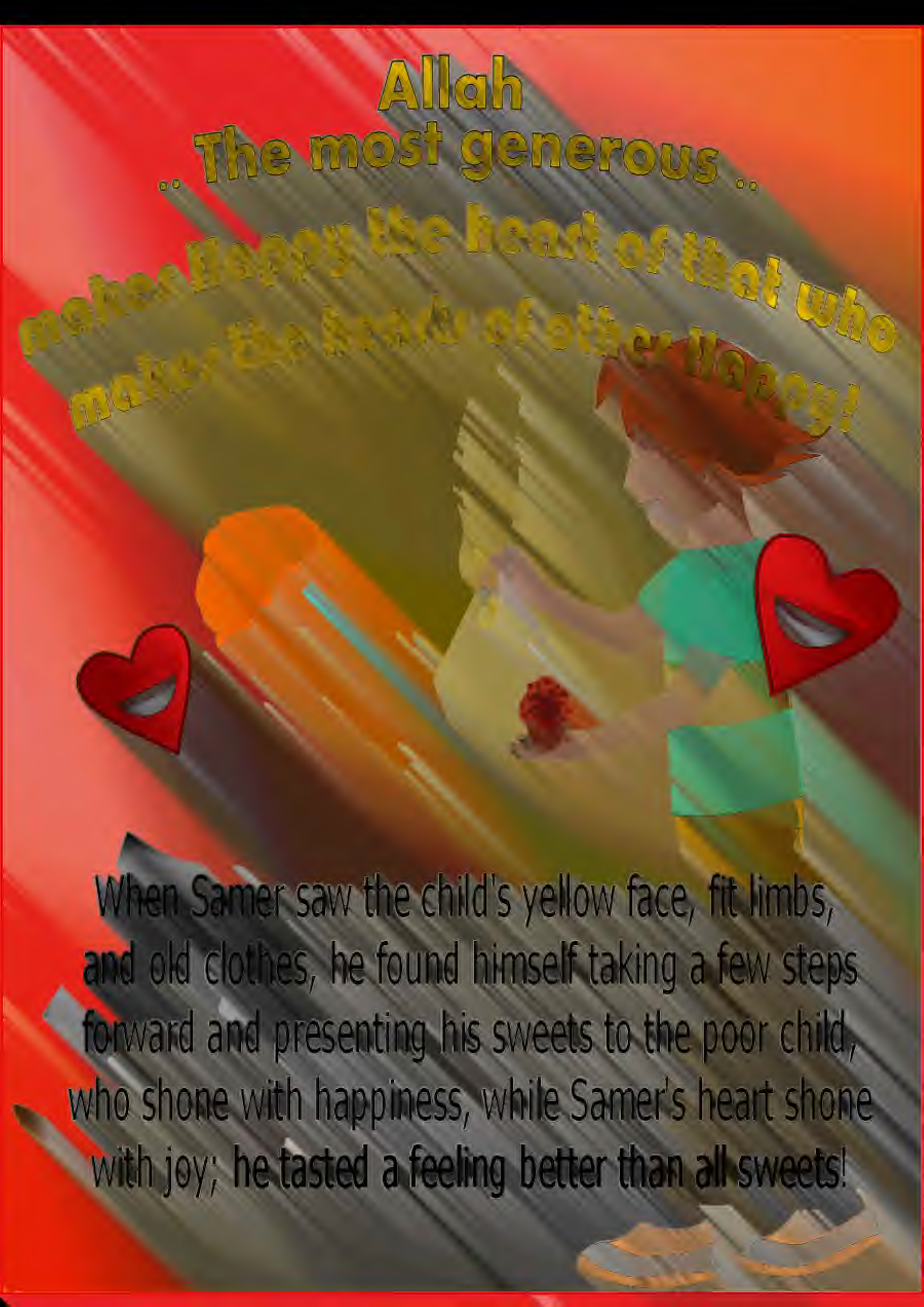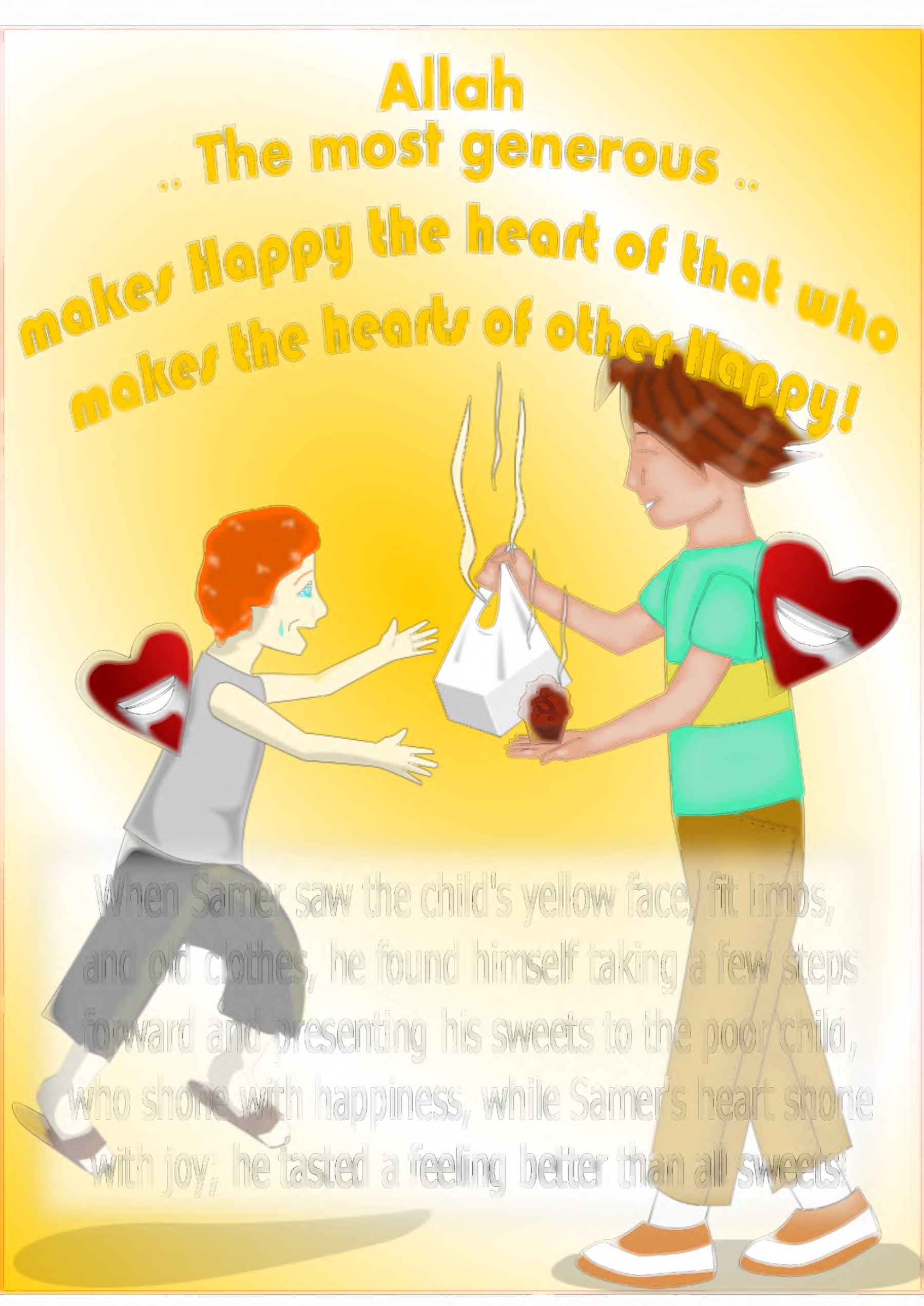 decorations, while Akram stood holding the table with his two smal hands and staring at the delicious colors of the sweets, his saliva dripping as he imagined his teeth chewing them piece by piece.. Shal I eat them or leave them to my cousins?