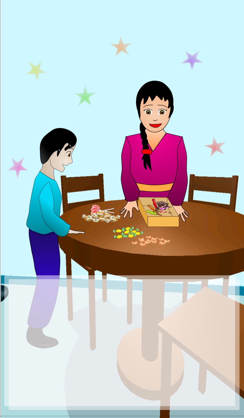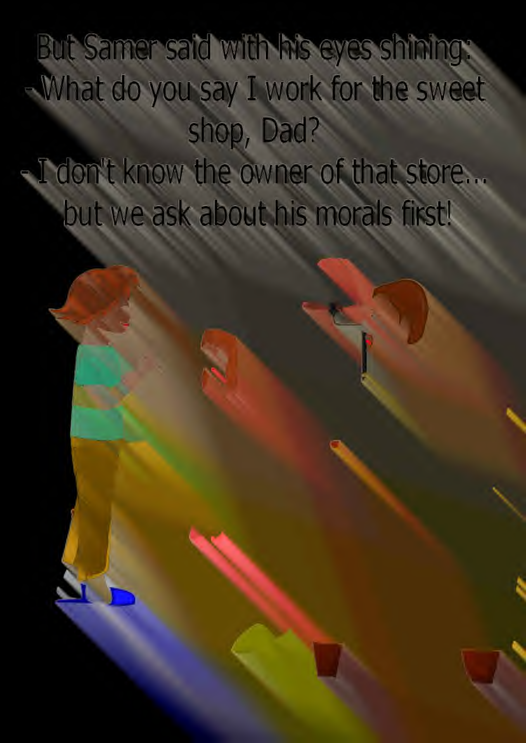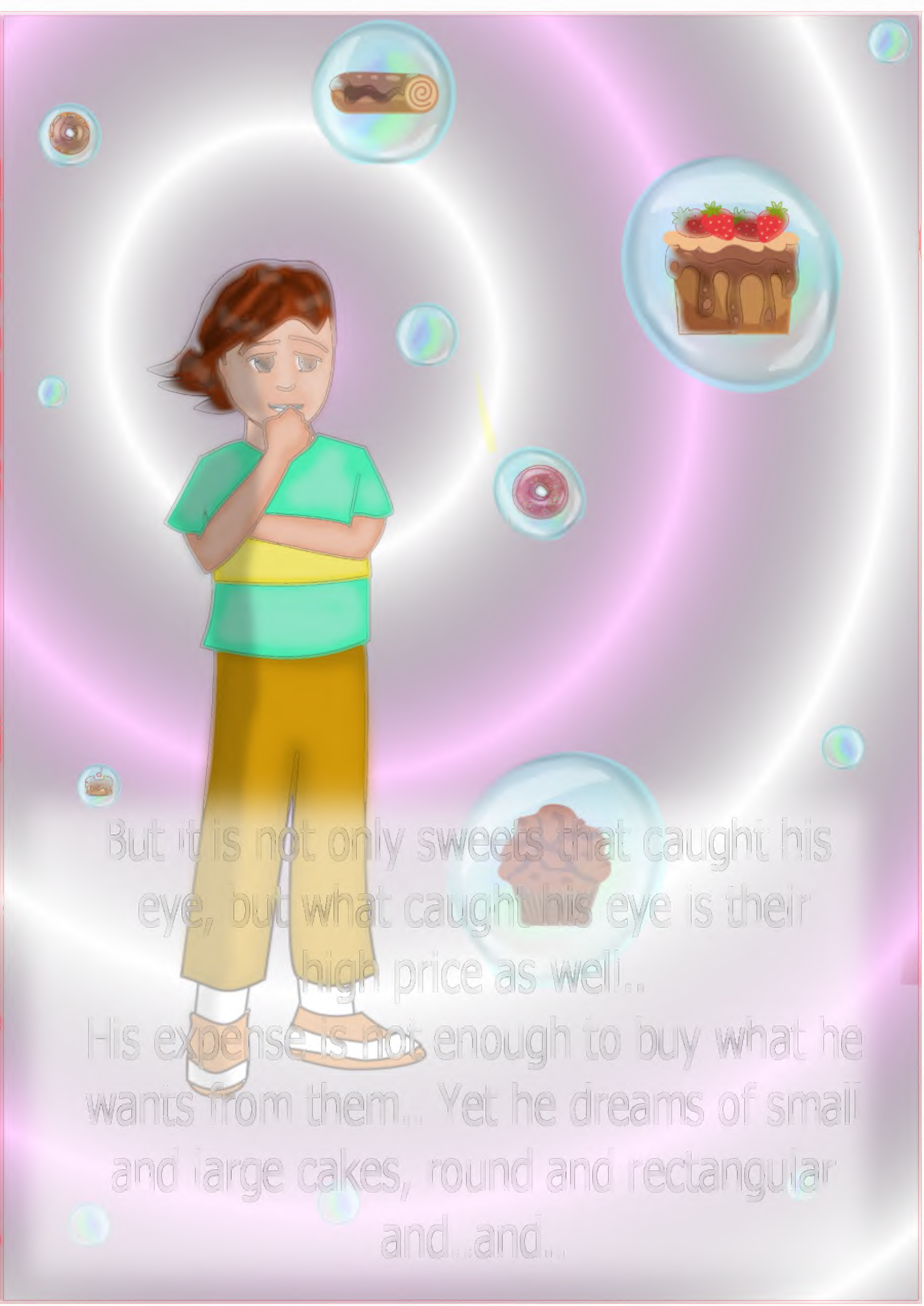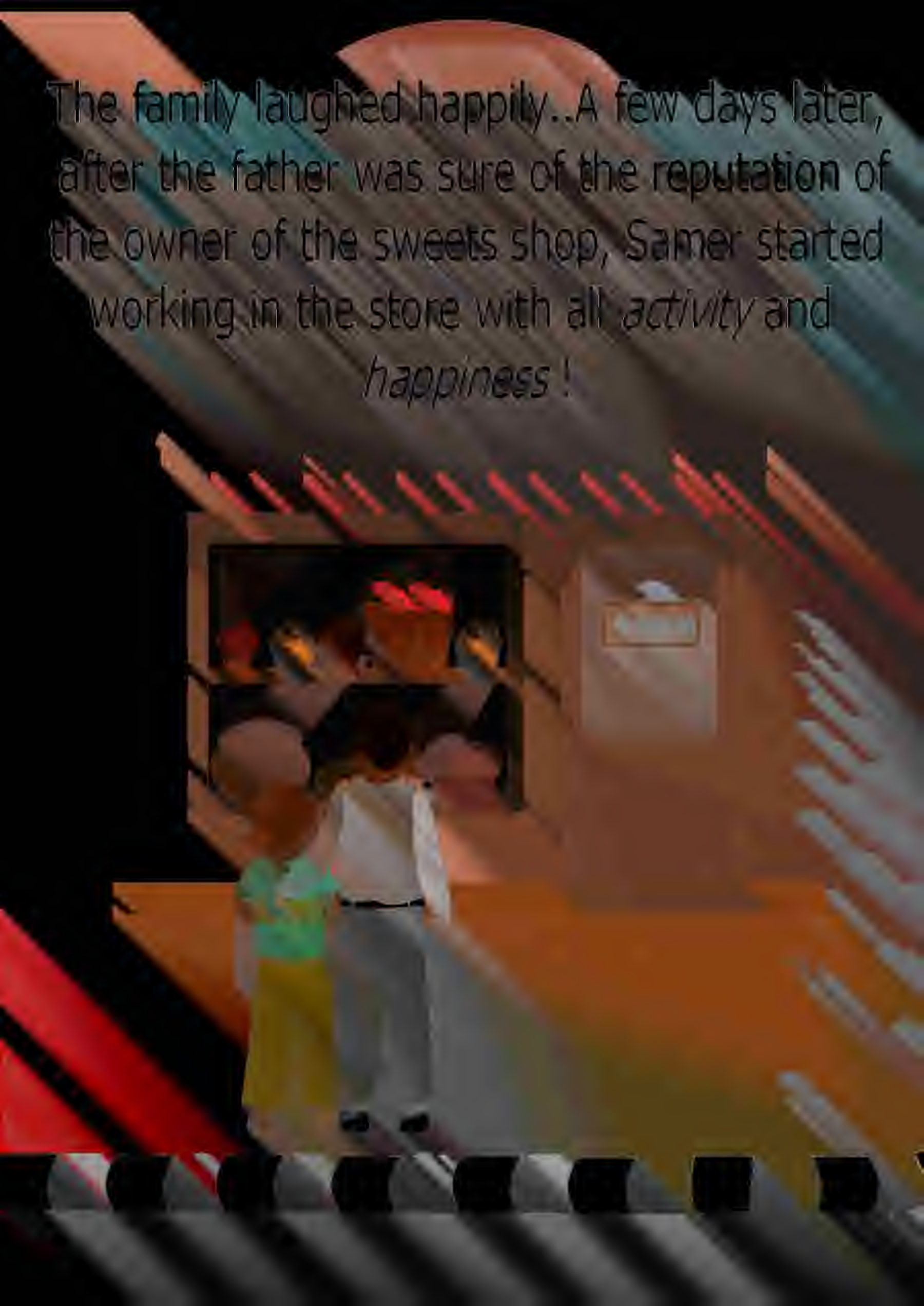 decorations, while Akram stood holding the table with his two smal hands and staring at the delicious colors of the sweets, his saliva dripping as he imagined his teeth chewing them piece by piece.. Shal I eat them or leave them to my cousins?
