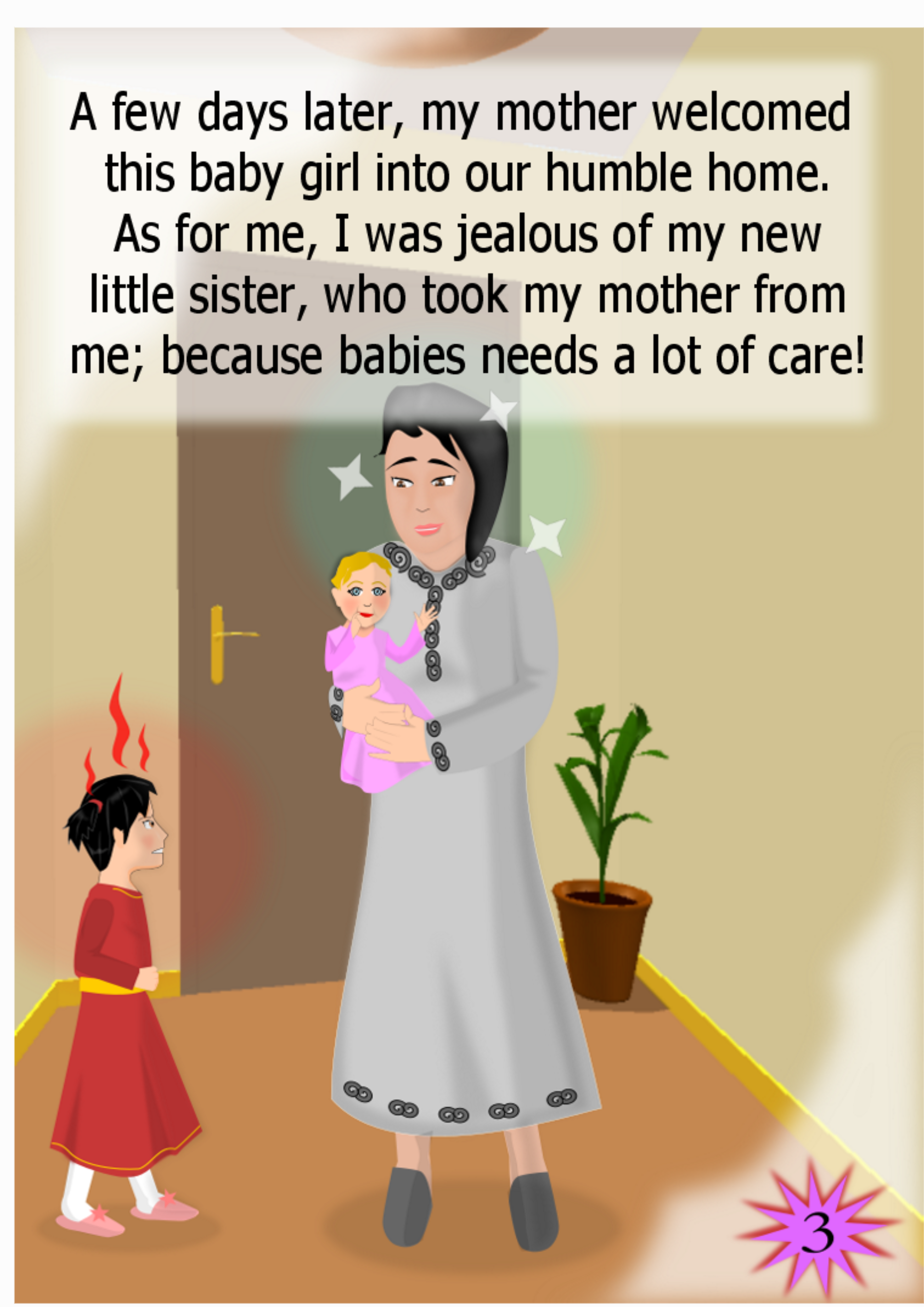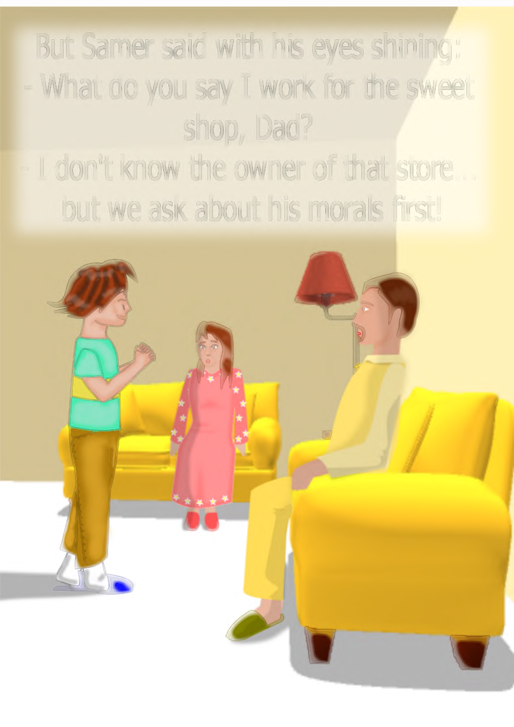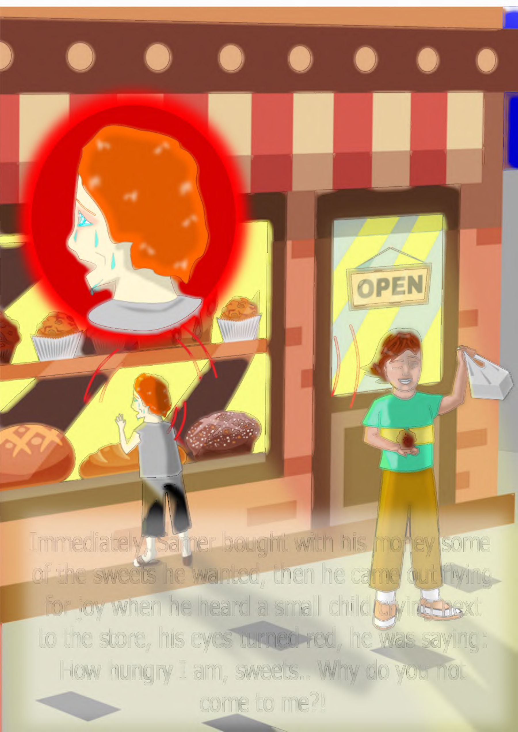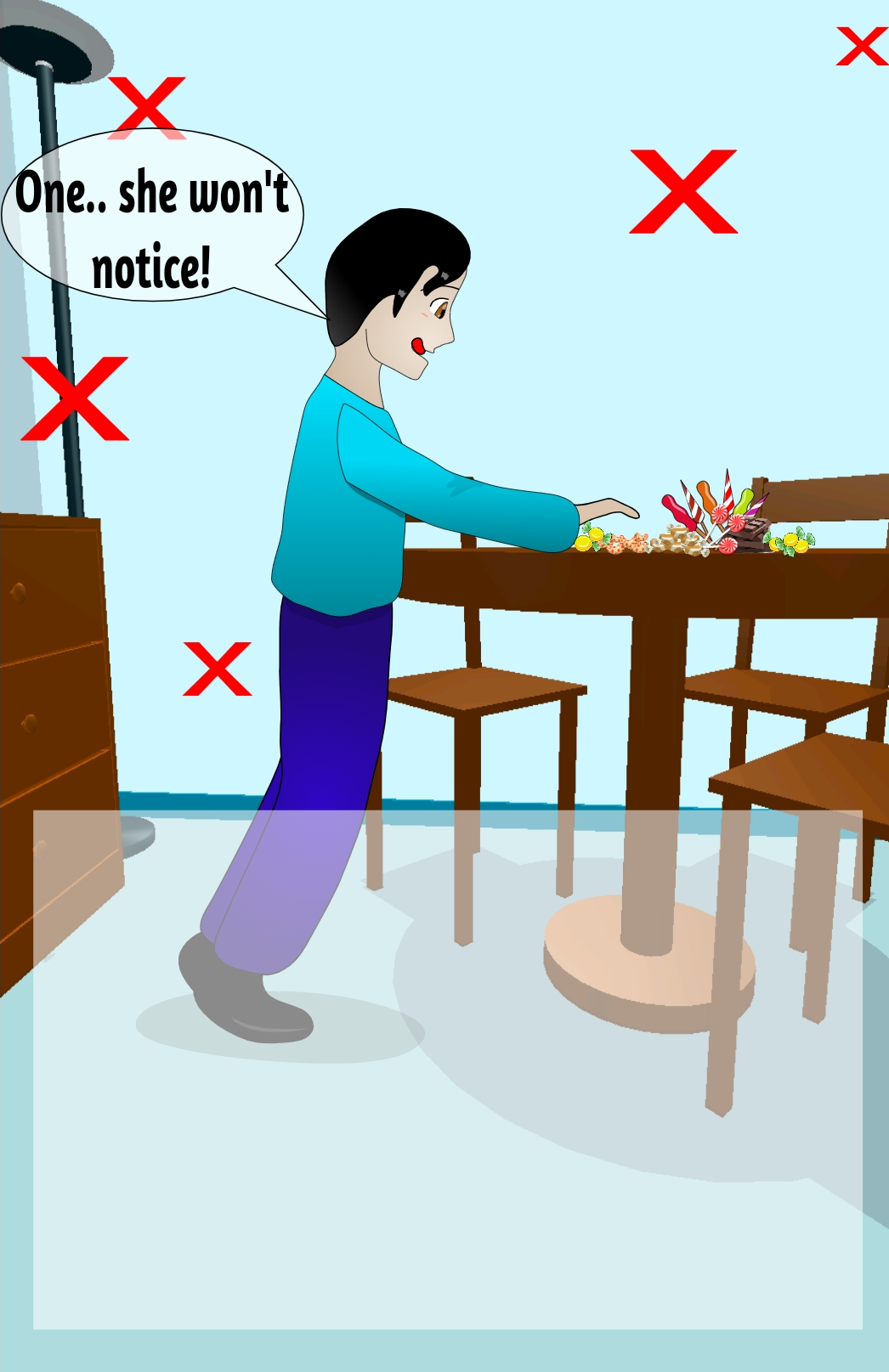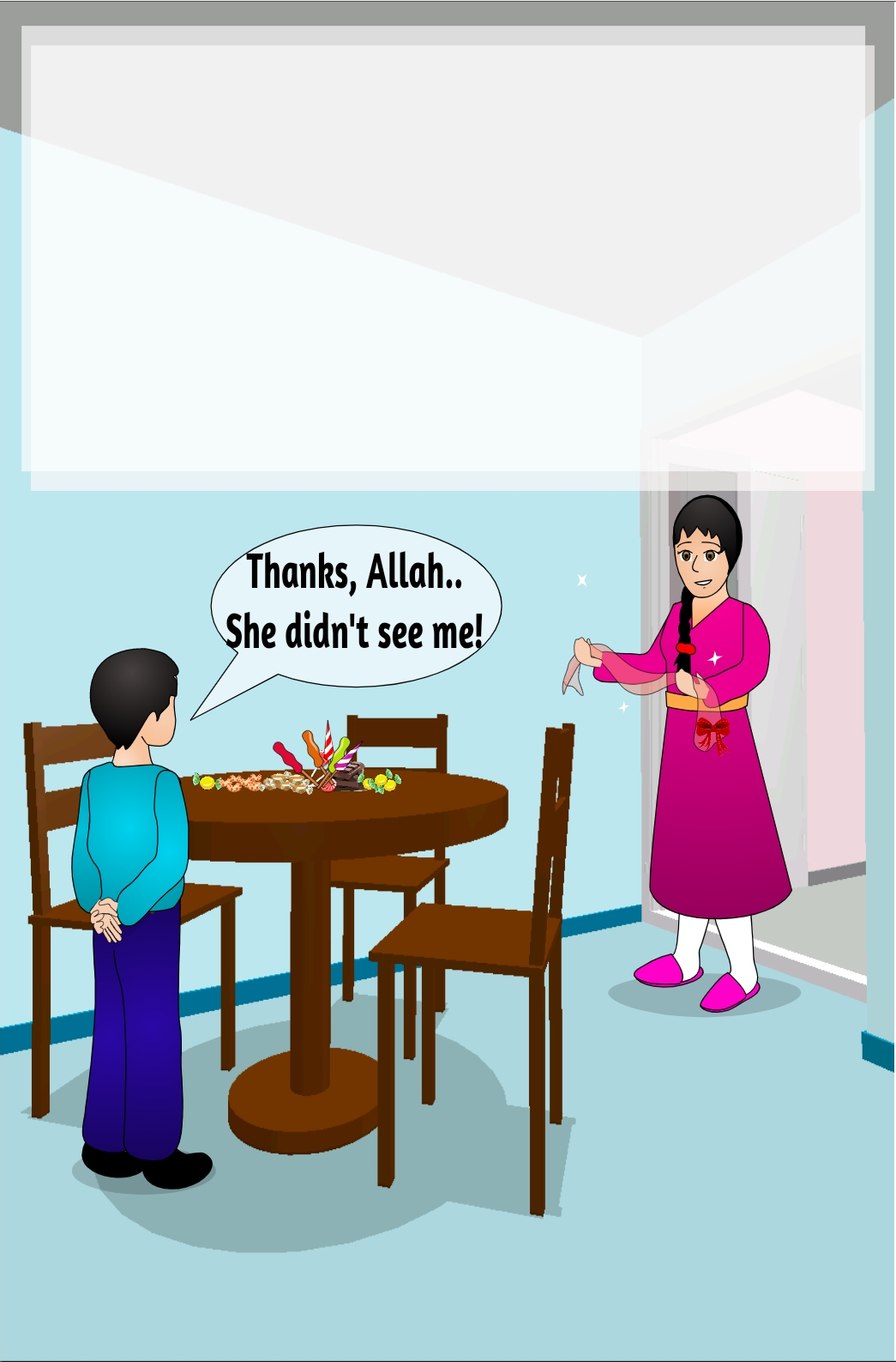 He swal owed the sugar and no one saw him, he was relieved of his fear before he re-thought of stealing more, but he heard the sound of his sister's steps coming into the room, so he put his hands back down, while she entered smiling with the decorations shining in her hand and stood wrapping the sweets while she hummed (whispering singing)!