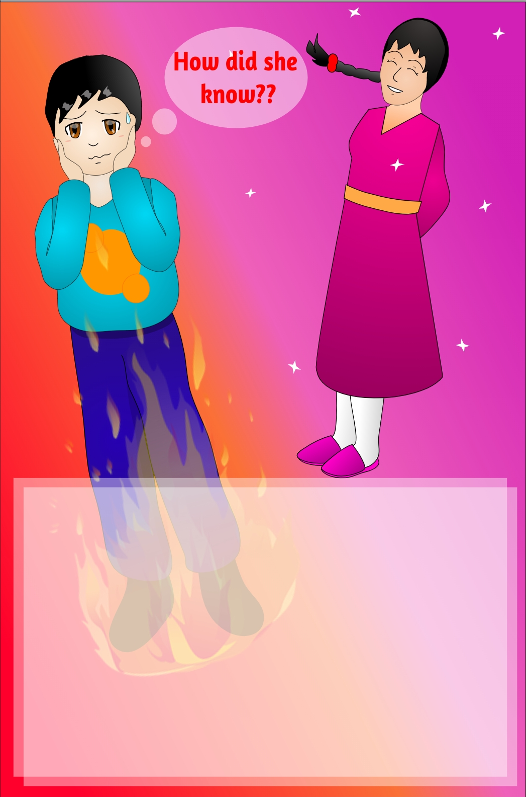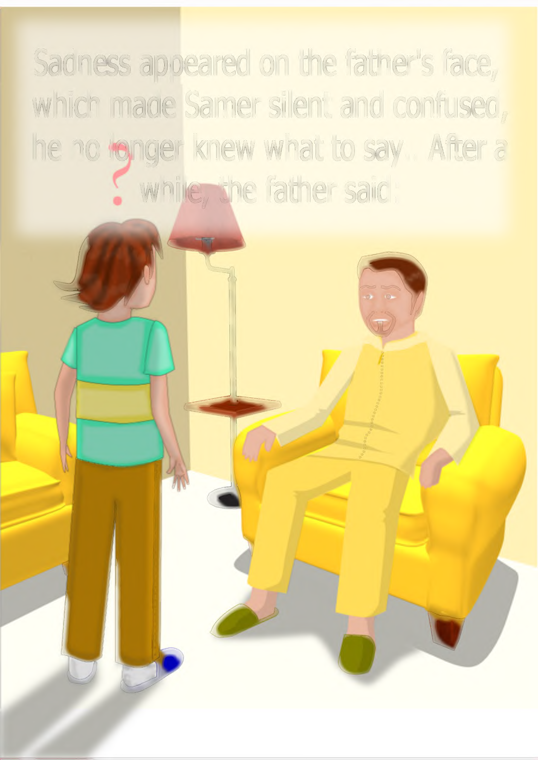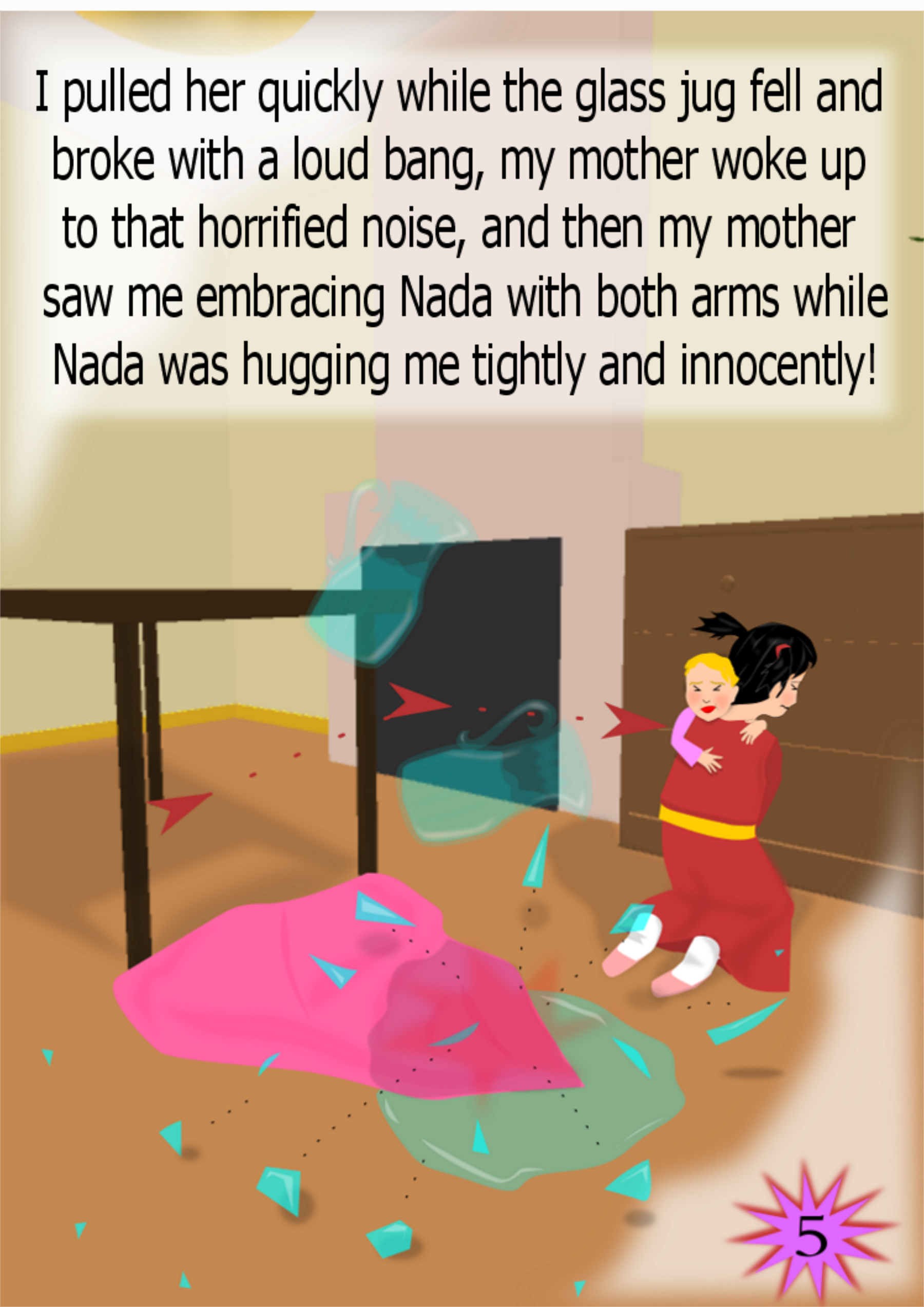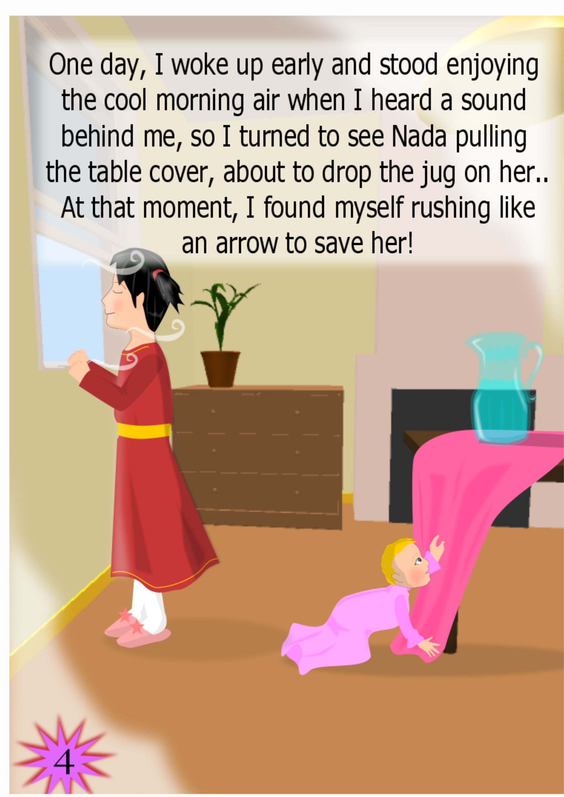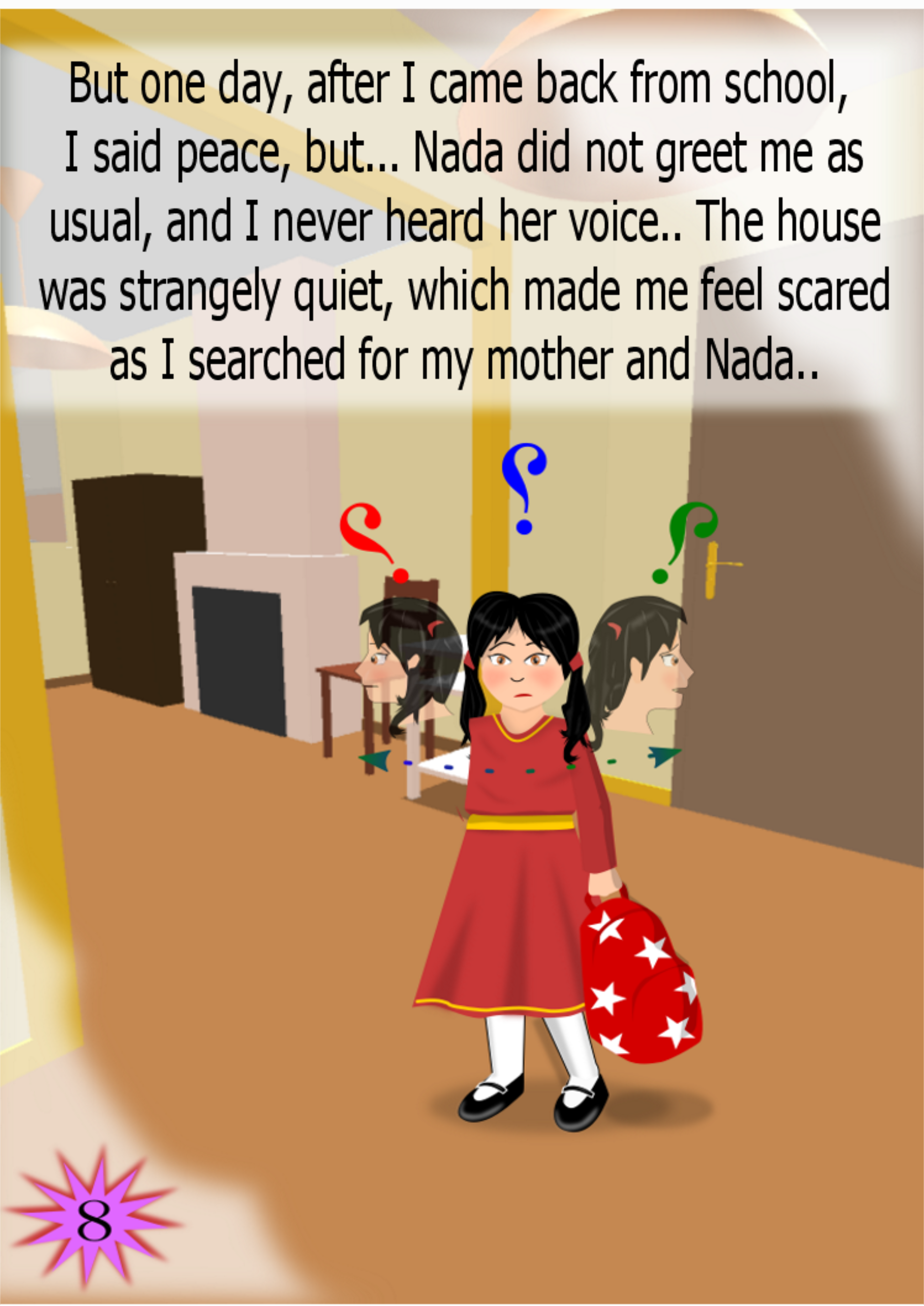 He swal owed the sugar and no one saw him, he was relieved of his fear before he re-thought of stealing more, but he heard the sound of his sister's steps coming into the room, so he put his hands back down, while she entered smiling with the decorations shining in her hand and stood wrapping the sweets while she hummed (whispering singing)!