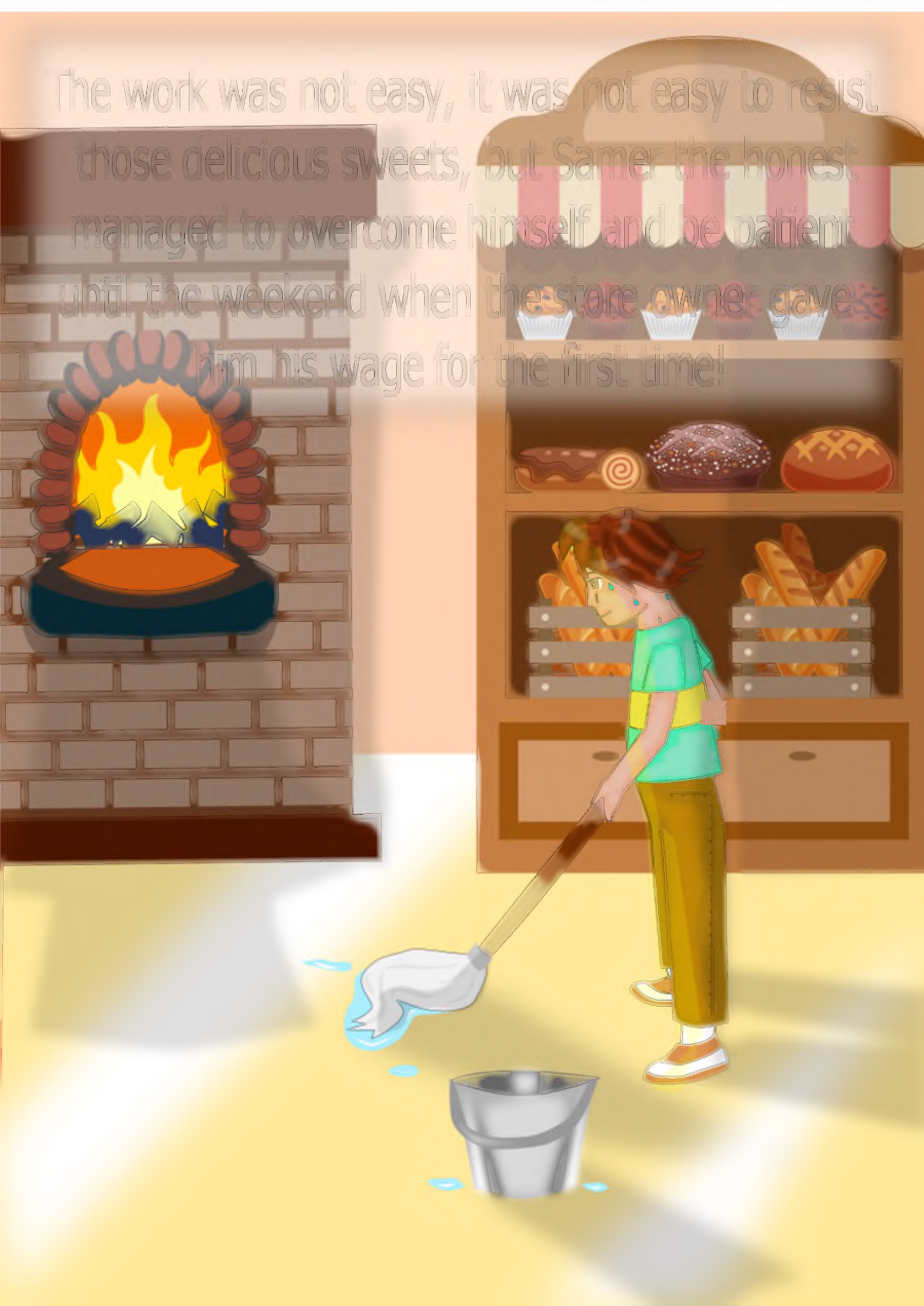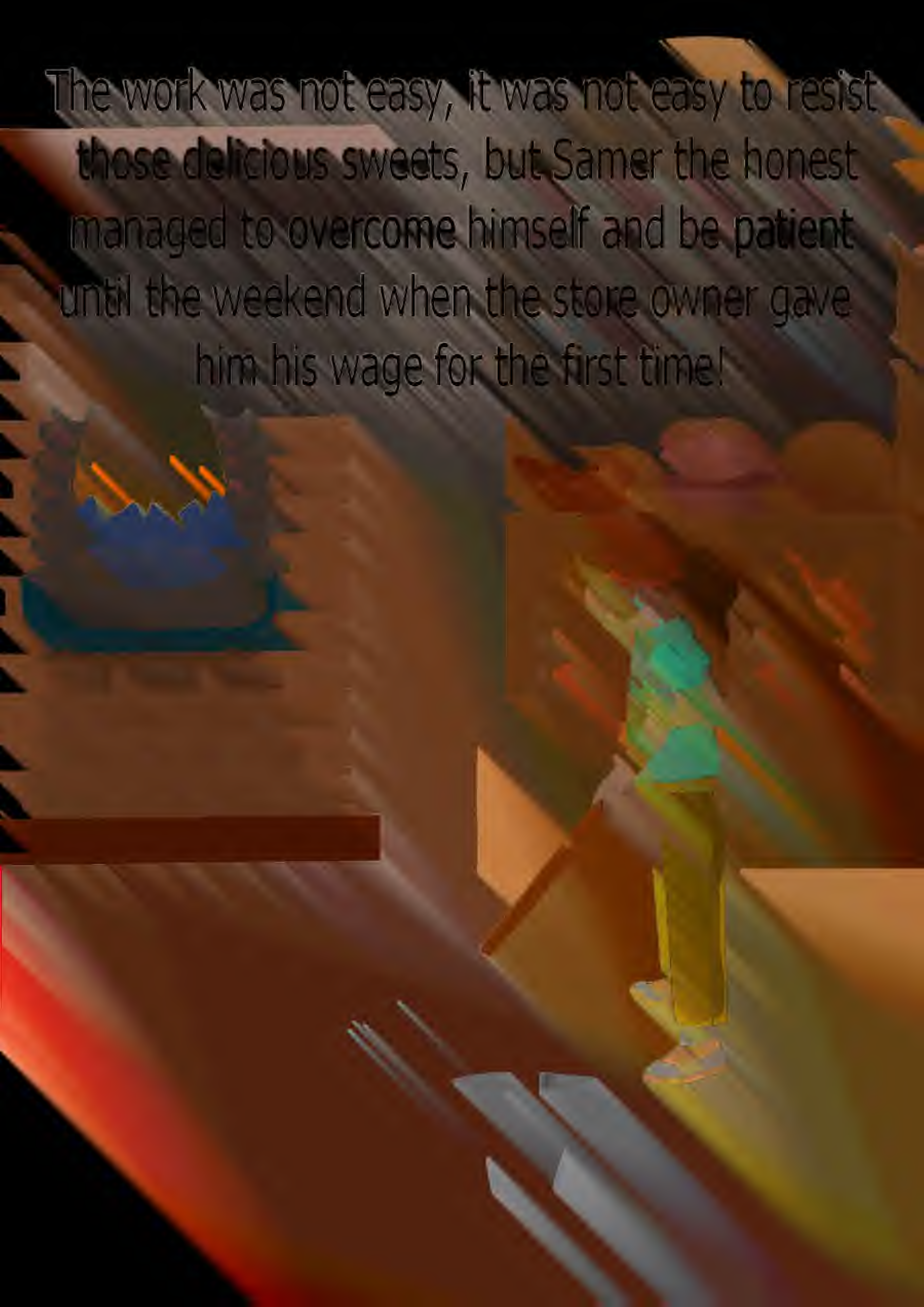 And suddenly, in an unfortunate moment of weakness, he lost his honesty, and his hand greedily extended and slipped (lightly took) some pieces of sweets, and put them in his mouth, and his tongue began to enjoy the taste of sugar while his eyes wandered left and right with fear watching; Wil anyone see me??