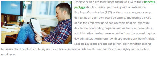 Additionally, consider the amount of time it would take to verify that every expense an employee submits for reimbursement is eligible under the Code. Unless you are intimately familiar with Section 125 of the Internal Revenue Code and the lengthy list of eligible expenses for each type of FSA you want to offer, you will need to outsource this function to a third party vendor. Penalties for non-compliance are astonishing and could lead to outright disqualification of your entire Section 125 plan, resulting in serious financial consequences to your employees in the form of taxes and to your company, in the form of taxes and penalties.