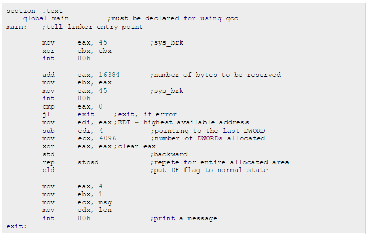 In case of any error, sys_brk() returns -1 or returns the negative error code itself. The following example demonstrates dynamic memory allocation.