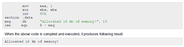 The following program allocates 16kb of memory using the sys_brk() system call: