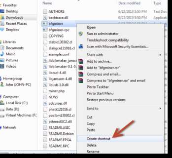3. Right-click bfgminer.exe and Create Shortcut