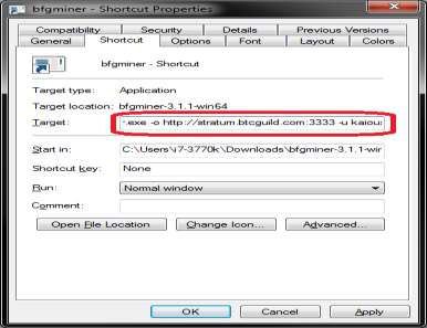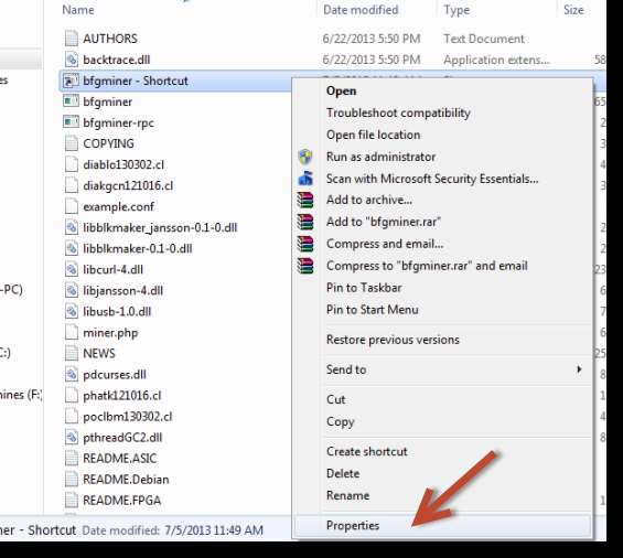 4. Right click the shortcut to bfgminer-shortcut and click on Properties