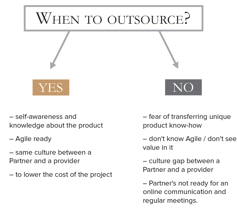 Secondly, outsourcing is neither good for the Partner nor for his or her business if he or she doesn't know Agile software development or doesn't see any value in it. The Scrum framework, even though it appears to be simple, is a difficult and disciplined approach that ignites change and helps organisation evolve more rapidly with a better risk control, which requires full focus, openness, and courage. If the Partner is not ready to take up the glove - we recommend that he or she doesn't, although some evangelisation always takes place.