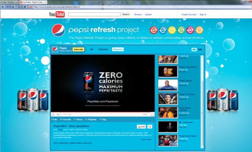 Figure 4- Pepsi Channel PageThe immediate sense of “Energetic”, “Creative” and “Young” can be felt by looking at the background and the header graphics designed by Pepsi (Figure 4).