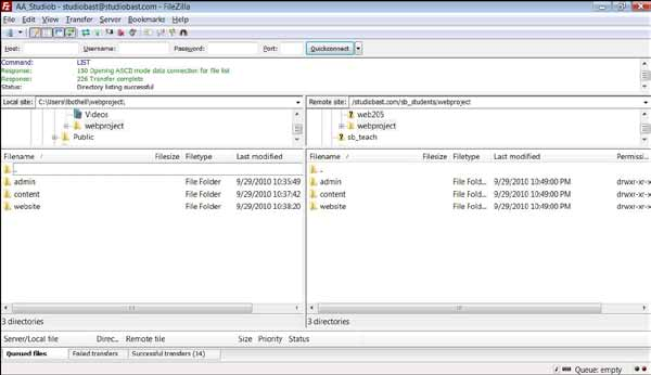 The FTP program will then try to connect with the Web host computer, and when it does so, your local computer directories will appear in the left pane, and the remote computer directories you will transfer to will appear in the right pane.
